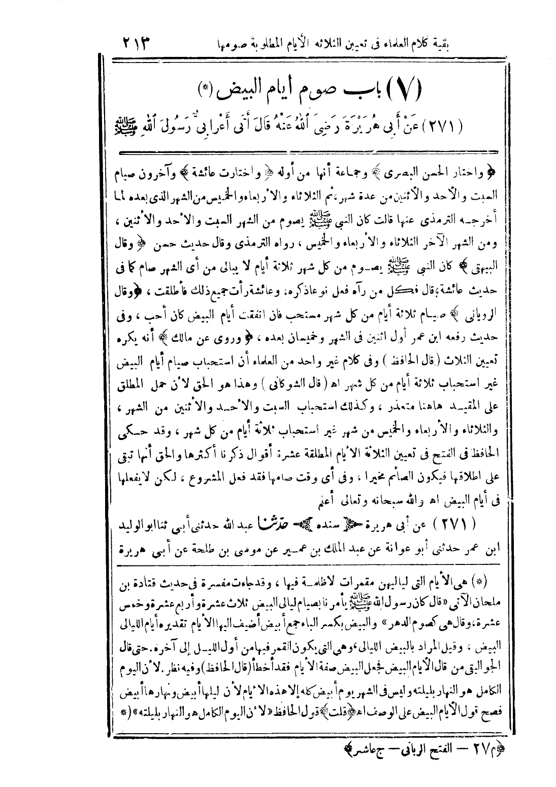 (*) هي الأيام التي لياليهن مقمرات لا ظلمة فيها، وقد جاءت مفسرة في حديث قتادة بن ملحان الآتي: "قال: كان رسول الله صلى الله عليه وسلم يأمرنا بصيام ليالي البيض ثلاثة عشرة وأربع عشرة وخمس عشرة. وقال هي كصوم الدهر" والبيض بكسر الباء جمع أبيض أضيف إليها الأيام تقديره أيام اليالي البيض، وقيل المراد بالبيض الليالي، وهي التي يكون القمر فيها من أول الليل إلى آخره. حتى قال الجو البقى من قال الأيام البيض فجعل البيض صفة الأيام فقد أخطأ (قال الخافظ) وفيه نظر. لأن اليوم الكامل هو النهار بليلته وليس في الشهر يوم أبيض كله إلا هذه الأيام لأن ليلها أبيض ونهارها أبيض فصح قول الأيام البيض على الوصف أهـ (قلت) قول الحافظ "لأن اليوم الكامل هو النهار بليلته" (*)