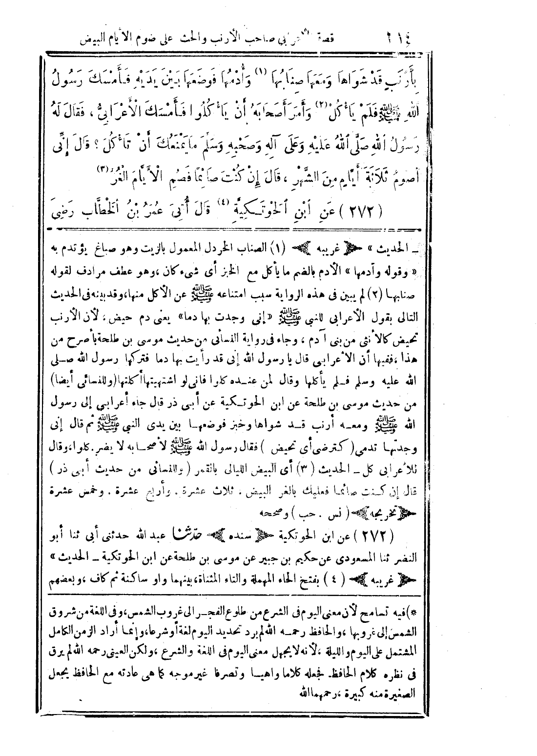 - الحديث" (غريبه) (1) الصناب الخردل المعمول بالزيت وهو صباغ يؤتدم به "وقوله وآدمها" الأدم بالضم ما يأكل مع الخبز أي شيء كان، وهو عطف مرادف لقوله صنابها (2) لم يبين في هذه الرواية سبب امتناعه صلى الله عليه وسلم عن الأكل منها، وقد بينه في الحديث التالي بقول الأعرابي للنبي صلى الله عليه وسلم "إني وجدت بها دماً" يعني دم حيض، لأن الأرنب تحيض كالأنثى من بني آدم، وجاء في رواية النسائي من حديث موسى بن طلحة بأصرح من هذا، ففيها أن الأعرابي قال يا رسول الله إني قد رأيت بها دماً فتركها رسول الله صلى الله عليه وسلم فلم يأكلها وقال لمن عنده كلوا فإني لو اشتهيتها أكلتها (وللنسائي أيضاً) من حديث موسى بن طلحة عن ابن الحوتكية عن أبي ذر قال جاء أعرابي إلى رسول الله صلى الله عليه وسلم ومعه أرنب قد شواها وخبز فوضعها بين يدي النبي صلى الله عليه وسلم ثم قال إني وجدتها تدمي (كترضى أي تحيض) فقال رسول الله صلى الله عليه وسلم لأصحابه لا يضر. كلوا، وقال للأعرابي كل- الحديث (3) أي البيض الليالي بالقمر (وللنسائي من حديث أبي ذر) قال إن كنت صائماً فعليك بالغز البيض. ثلاث عشرة. وأربع عشرة. وخمس عشرة (تخريجه) (نس. حب) وصححه