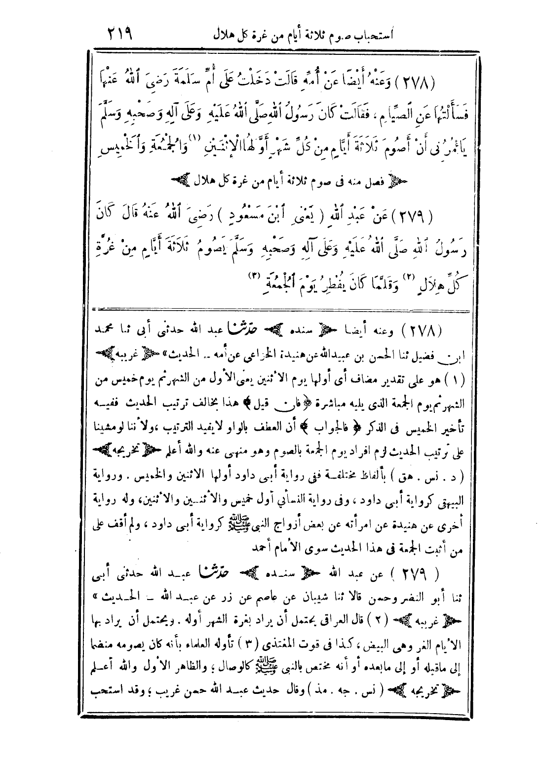 (279) عن عبد الله (سنده) حدثنا عبد الله حدثني أبي ثنا أبو النضر وحسن قالا ثنا شيبان عن عاصم عن زر عن عبد الله - الحديث" (غريبه) (2) قال العراقي يحتمل أن يراد بغرة الشهر أوله. يحتمل أن يراد بها الأيام الغر وهي البيض، كذا في قوت المفتذى (3) تأوله العلماء بأنه كان يصومه منضمًا إلى ما قبله أو إلى ما بعده أو أنه مختص بالنبي صلى الله عليه وسلم كالوصال؛ والظاهر الأول والله أعلم (تخريجه) (نس. جه. مذ) وقال حديث عبد الله حسن غريب؛ وقد استحب