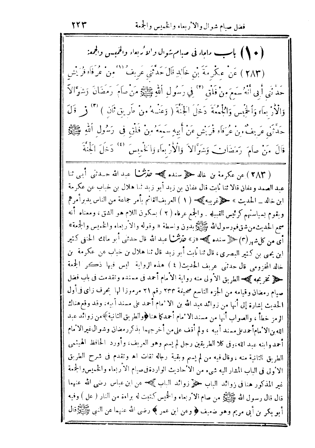 (283) عن عكرمة بن خالد (سنده) حدثنا عبد الله حدثني أبي ثنا عبد الصمد وعفان قالاً ئنا ثابت قال عفان بن زيد ثبا هلال بن خباب عن عكرمة ابن خالد- الحديث" ((غريبه) العريف القائم بأمر جماعة من الناس يدبر أمرهم ويقوم بسياستهم كرئيس القبيلة. والجمع عرفاء بسكون اللام هو الشق, ومعناه انه سمع الحديث من شق فم رسول الله صلى الله عليه وسلم بدون واسطة "وقوله والأربعاء والخميس والجمعة" أي من كل شهر (سنده) حدثنا عبد الله قال حدثني أبو مالك الحنفي كثير ابن يحي بن كثير البصري, قال ئنا ثابت أبو زيد قال ثنا هلال بن خياب عن عكرمة بن خالد المخزومي قال حدثني عريف الحديث هذه الرواية ليس فيها ذكر الجمعة (تخريجة الطريق الأولي منه رواية الأمام أحمد في مسنده وتقدمت في باب فضل صيام رمضان وقيامه من الجزء التاسع صحيفة 233 رقم 21 مرموزاً لها بحرف زاي في أول الحديث إشارة إلى انها من زوائد عبد الله بن الأمام أحمد علي مسند أبيه, وقد وقع هناك الرمز خطأ, والصواب أنها من مسند الأمام أحمد كما هنا (والطريق الثانية) من زوائد عبد الله بن الأمام أحمد علي مسند أبيه, ولم أقف على من أخرجهما بذكر رمضان وشوال غير الأمام أحمد وابنه عبد الله, وفي كلا الطريقين رجل لم يسم وهو العريف, وأورد الحافظ الهيثمي الطريق الثانية منه, وقال فيه من لم يسم وبقية رجاله ثقاب وتقدم في شرح الطريق الأولى في الباب المشار إليه شيء من الأحاديث الواردة في صيام الأربعاء والخميس والجمعة غير المذكور هنا في زوائد الباب (زوائد الباب) عن ابن عباس رضي الله عنهما قال قال رسول الله صلى الله عليه وسلم من صام الأربعاء والخميس كتبت له براءة من النار (عل) وفيه أبو بكر بن أبي مريم وهو ضعيف (وعن ابن عمر) رضي الله عنهما عن النبي صلى الله عليه وسلم قال