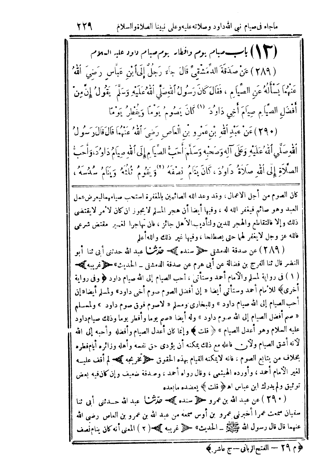 (289) عن صدقة الدمشقي قال جاء رجل إلى ابن عباس رضي الله عنهما يسأله عن الصيام, فقال كان رسول الله صلى الله عليه وسلم يقول إن من أفضل الصيام صيام أخي داود كان يصوم يوماً ويفطر يوماً