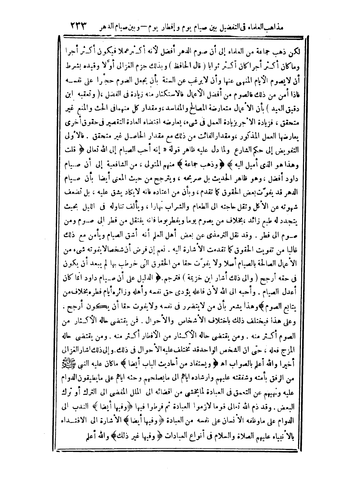لكن ذهب جماعة من العلماء إلى أن صوم الدهر أفضل لأنه أكثر عملاً فيكون أكثر أجراً وما كان أكثر أجراً كان أكثر ثواباً (قال الحافظ) وبذلك جزم الغزالي أولاً وقيده بشرط أن لا يصوم الأيام المنهي عنها وأن لا يرغب عن السنة بأن يجعل الصوم حجراً على نفسه فاذا أمن من ذلك فالصوم من أفضل الأعمال فالاستكثار منه زيادة في الفضل, (وتعقبه ابن دقيق العيد) بأن الأعمال متعارضة المصالح والمفاسد, ومقدار كل منهما في الحث والمنع غير متحقق, فزيادة الأجر بزيادة العمل في شيء, يعارضه اقتضاء العادة التقصير في حقوق أخرى يعارضها العمل المذكور, ومقدار الفائت من ذلك مع مقدار الحاصل غير متحقق. فالأولى التفويض إلى حكم الشارع ولما دل عليه ظاهر قوله" إنه أحب الصيام إلى الله تعالى (قلت وهذا هو الذي أميل إليه) (وذهب جماعة) منهم المتولي, من الشافعية إلى أن صيام داود أفضل, وهو ظاهر الحديث بل صريحه, ويترجح من حيث المعني أيضاً بأن صيام الدهر قد يفوت بعض الحقوق كما تقدم, وبأن من اعتاده فانه لا يكاد يشق عليه, بل تضعف شهوته عن الأكل وتقل حاجته إلى الطعام والشراب نهاراً, ويألف تناوله في الليل بحيث يتجدد له طبع زائد, بخلاف من يصوم يوماً ويفطر يوماً فانه ينتقل من فطر إلى صوم ومن صوم إلى فطر. وقد تقل الترمذي عن بعض أهل العلم أنه أشق الصيام ويأمن مع ذلك غالباً من تفويت الحقوق كما تقدمت الإشارة إليه. نعم إن فرض أن شخصاً لا يفوته شيء من الأعمال الصالحة بالصيام أصلاً ولا يفوت حقاً من الحقوق التي خوطب بها لم يبعد أن يكون في حقه أرجح (والى ذلك أشار ابن خزيمة) فترجم. (الدليل على أن صيام داود إنما كان أعدل الصيام. وأحبه إلى الله لأن فاعله يؤدي حق نفسه ولا يفوت حقاً أن يكون أرجح. وعلى هذا فيختلف ذلك باختلاف الأشخاص والأحوال. فمن يقتضي حاله الإكثار من الصوم أكثر منه. ومن يقتضي حاله الإكثار من الإفطار أكثر منه. ومن يقتضي حاله المزج فعله, حي إن الشخص الواحد قد تختلف عليه الأحوال في ذلك. وإلى ذلك أشار الغزالي أخيراً والله اعلم بالصواب (ويستفاد من أحاديث الباب أيضاً) ما كان عليه النبي صلى الله عليه وسلم من الرفق بأمته وشفقته عليهم وإرشاده إياهم إلى ما يصلحهم وحثه إياهم على ما يطيقون الدوام عليه ونهيهم عن التعمق في العبادة لما يخشى من أفضائه إلى الملل المفضي إلى الترك أو ترك البعض. وقد ذم الله تعالى قوما لازموا العبادة ثم فرطوا فيها (وفيها أيضاً) الندب إلى الدوام على ما وظفه الإنسان على نفسه من العبادة (وفيها أيضاً) الإشارة إلى الاقتداء بالأنبياء عليهم الصلاة والسلام في أنواع العبادات (وفيها غير ذلك) والله أعلم