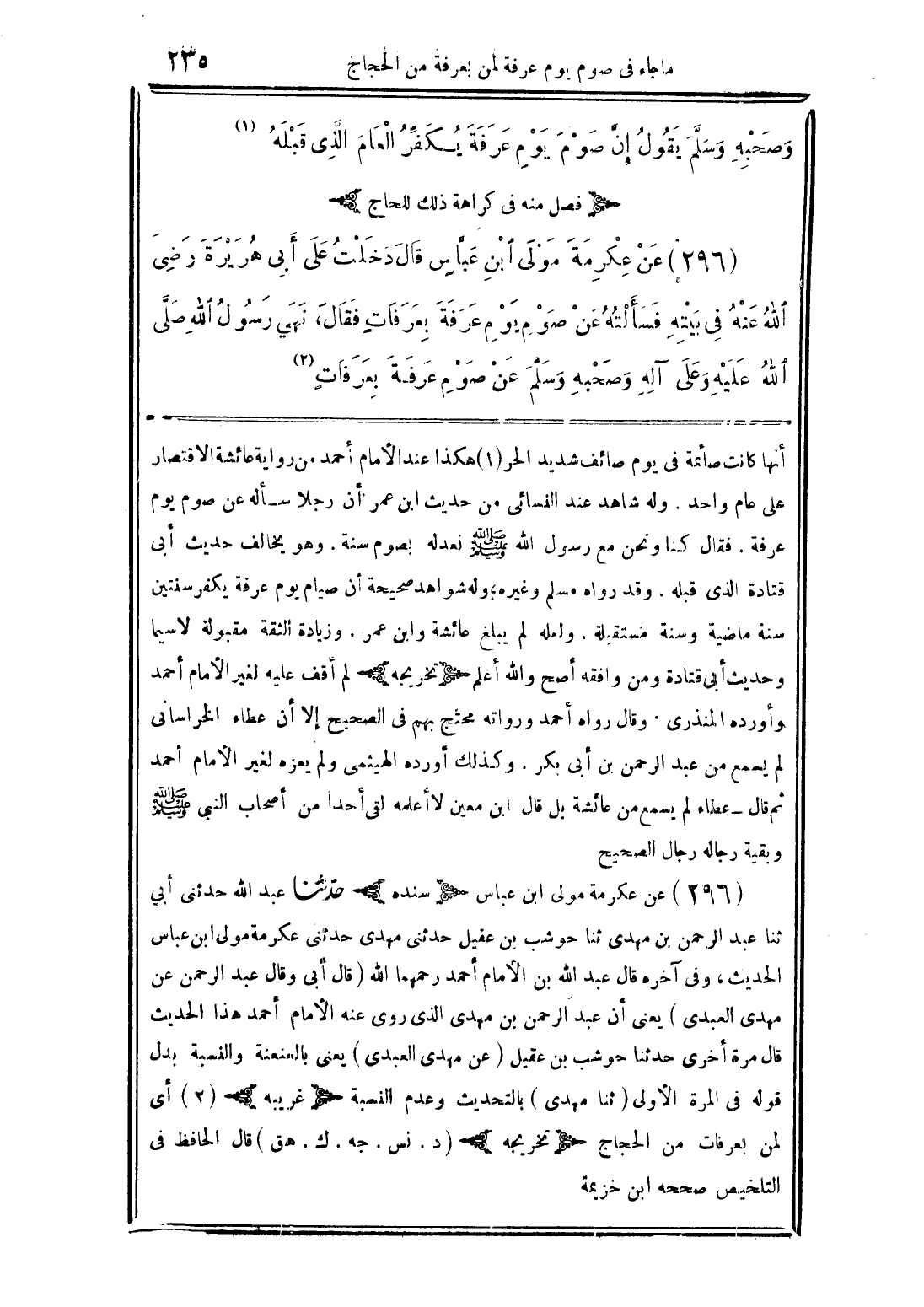 (296) عن عكرمة مولي ابن عباس قال دخلت على أبي هريرة رضي الله عنه في بيته فسألته عن صوم يوم عرفة بعرفات فقال، نهي رسول الله صلى الله عليه وعلى آله وصحبه وسلم عن صوم عرفة بعرفات