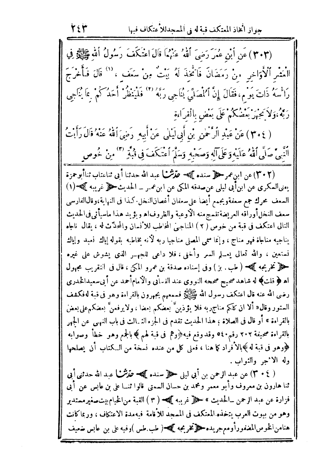 (304) عن عبد الرحمن بن أبي ليلى عن أبيه رضي الله عنه قال رأيت النبي صلى الله عليه وعلى آله وصحبه وسلم اعتكف في قبة من خوص