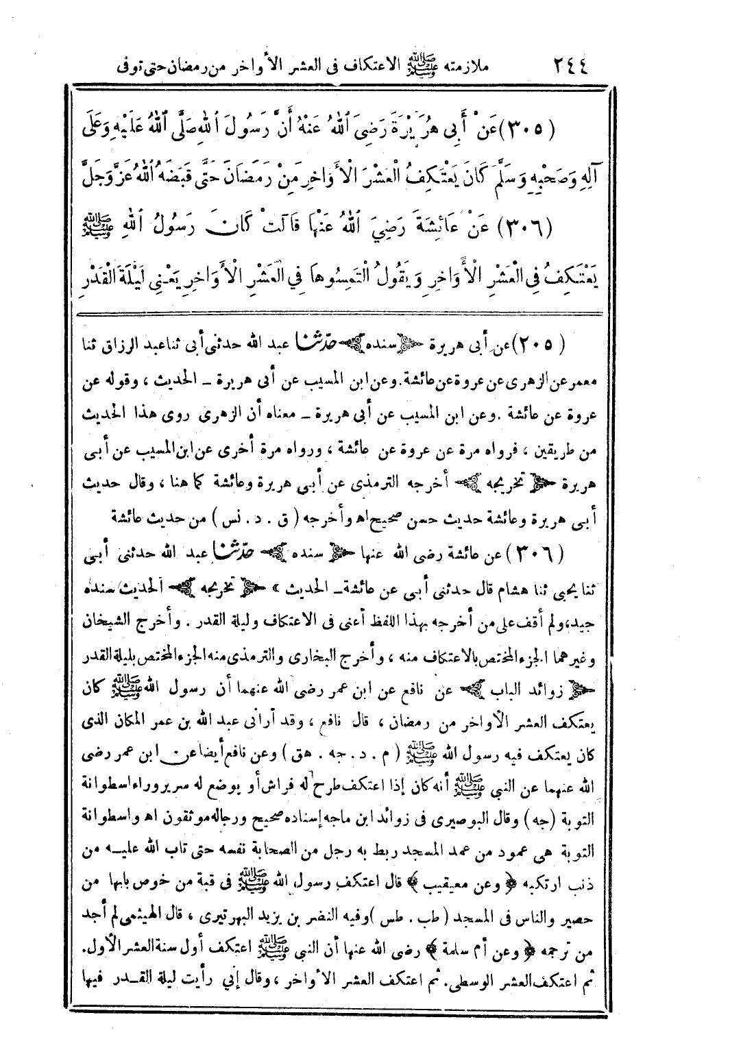 (305) عن أبي هريرة رضي الله عنه أن رسول الله صلى الله عليه وعلى آله وصحبه وسلم كان يعتكف العشر الأواخر من رمضان حتي قبضة الله عز وجل