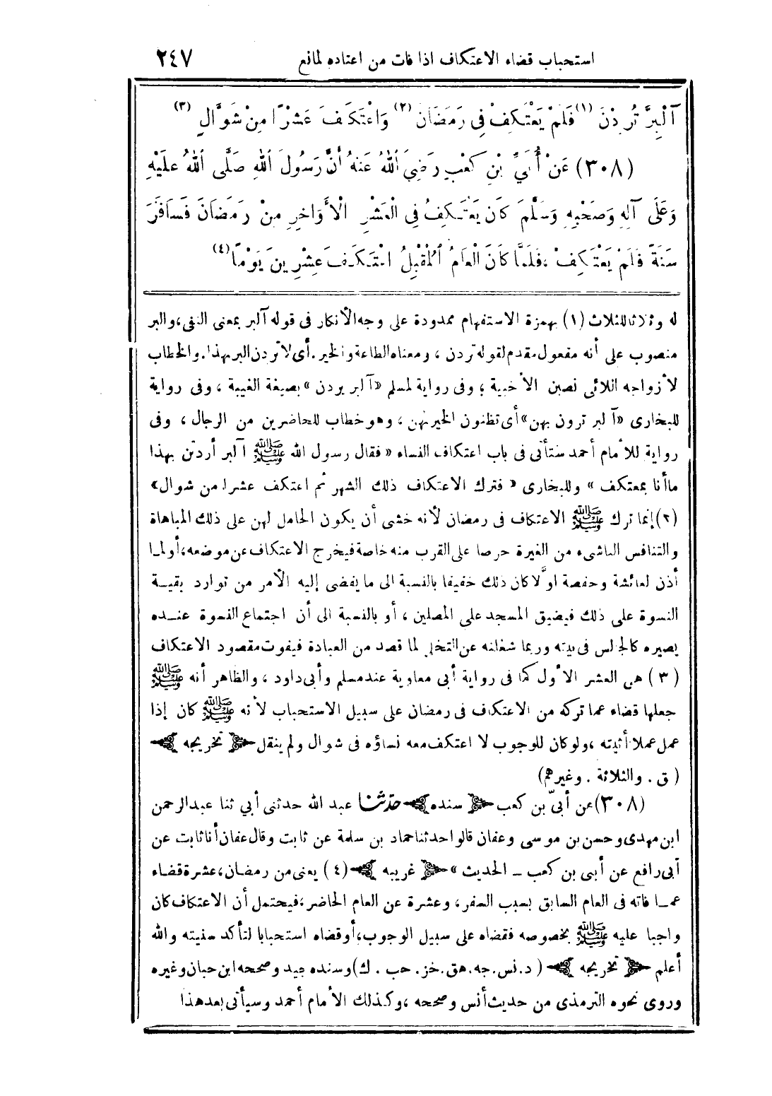 (308) عن أبي بن كعب رضي الله عنه أن رسول الله صلى الله عليه وعلى آله وصحبه وسلم كان يعتكف في العشر الأواخر من رمضان فسافر سنة فلم يعتكف، فلما كان العام المقبل اعتكف عشرين يومًا (4)