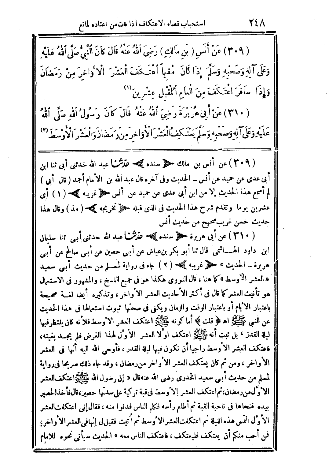 (309) عن أنس (بن مالك) رضي الله عنه قال كان النبي صلى الله عليه وعلى آله وصحبه وسلم إذا كان مقيمًا اعتكف العشر الأواخر من رمضان وإذا سافر اعتكف من العام المقبل عشرين (1)