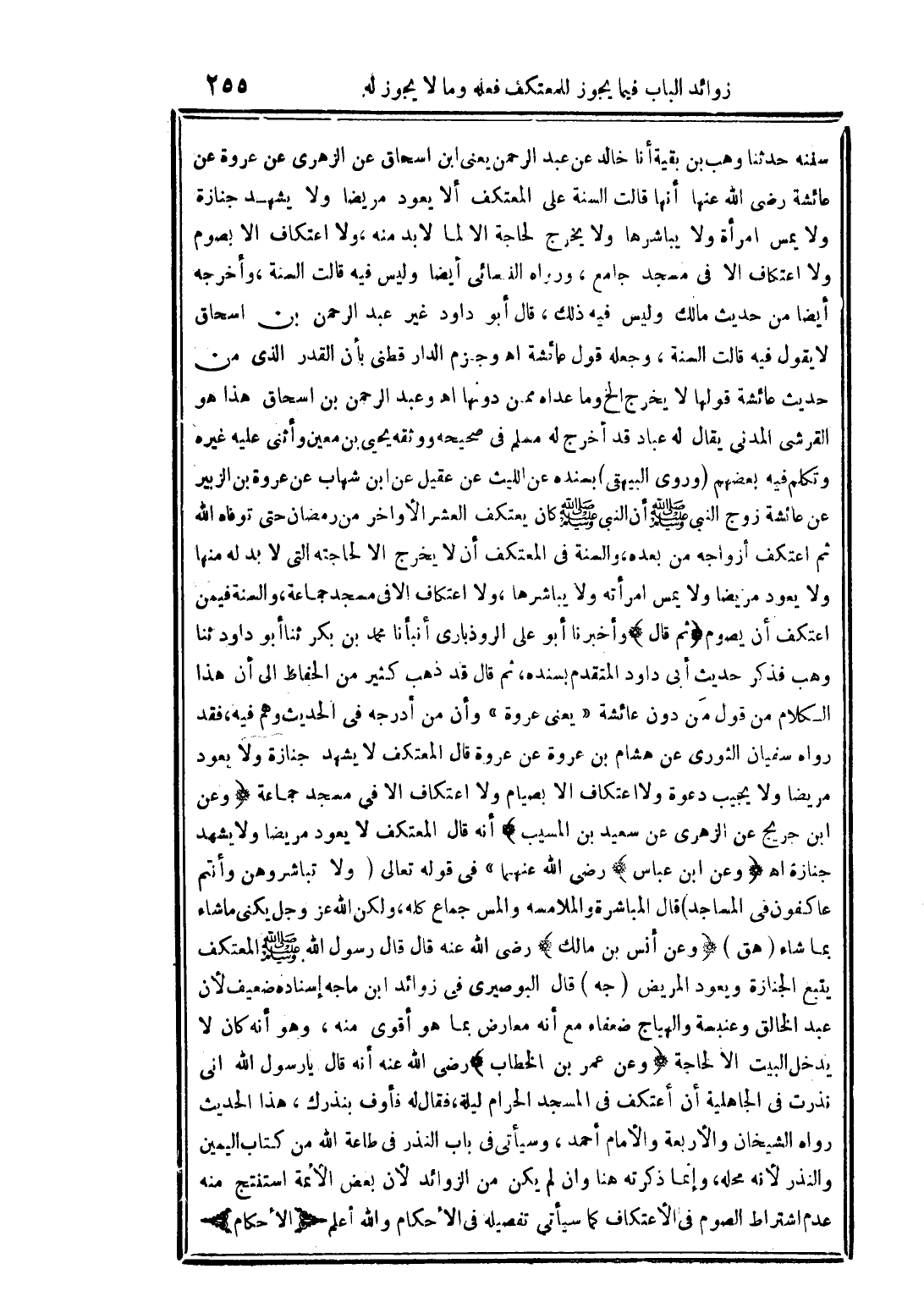 سننه حدثنا وهب بن بقية أنا خالد عن عبد الرحمن يعني ابن اسحاق عن الزهري عن عروة عن عائشة رضي الله عنها أنها قالت السنة على المعتكف ألا يعود مريضًا ولا يشهد جنازة ولا يمس امرأة ولا يباشرها ولا يخرج لحاجة إلا لما لابد منه، ولا اعتكاف إلا بصوم ولا اعتكاف إلا في مسجد جامع، ورواه النسائي أيضًا وليس فيه قالت السنة، وأخرجه أيضًا من حديث مالك وليس فيه ذلك، قال أبو داود غير عبد الرحمن بن اسحاق لا يقول فيه قالت السنة، وجعله قول عائشة اهـ وجزم الدار قطنى بأن القدر الذي من حديث عائشة قولها لا يخرج الخ وما عداه ممن دونها اهـ وعبد الرحمن بن اسحاق هذا هو القرشي المدني يقال له عباد قد أخرج له مسلم في صحيحه ووثقه يحيي بن معين وأثنى عليه غيره وتكلم فيه بعضهم (وروى البيهقي) بسنده عن الليث عن عقيل عن ابن شهاب عن عروة بن الزبير عن عائشة زوج النبي صلى الله عليه وسلم أن النبي صلى الله عليه وسلم كان يعتكف العشر الأواخر من رمضان حتى توفاه الله ثم اعتكف أزواجه من بعده، والسنة في المعكتف أن لا يخرج إلا لحاجته التي لابد له منها ولا يعود مريضًا ولا يمس امرأته ولا يباشرها، ولا اعتكاف إلا في مسجد جماعة، والسنة فيمن اعتكف ان يصوم (ثم قال) وأخبرنا أبو على الروذباري أنبأنا محمد بن بكر ثنا أبو داود ثنا وهب فذكر حديث أبي داود المتقدم بسنده، ثم قال قد ذهب كثير من الحفاظ إلى ان هذا الكلام من قول من دون عائشة "يعني عروة" وأن من أدرجه في الحديث وهم فيه، فقد رواه سفيان الثوري عن هشام بن عروة عن عروة قال المعتكف لا يشهد جنازة ولا يعود مريضًا ولا يجيب دعوة ولا اعتكاف إلا بصيام ولا اعتكاف إلا في مسجد جماعة (وعن ابن جريج عن الزهري عن سعيد بن المسيب) أنه قال المعتكف لا يعود مريضًا ولا يشهد جنازة اهـ (وعن ابن عباس) رضي الله عنهما" في قوله تعالى (ولا تباشروهن وأنتم عاكفون في المساجد) قال المباشرة والملامسة والمس جماع كله، ولكن الله عز وجل يكني ما شاء بما شاء (هق) (وعن أنس بن مالك) رضي الله عنه قال قال رسول الله صلى الله عليه وسلم المعتكف يتبع الجنازة ويعود المريض (جه) قال البوصيري في زوائد ابن ماجه إسناده ضعيف لأن عبد الخالق وعنبسة والهياج ضعفاء مع أنه معارض بما هو أقوى منه، وهو أنه كان لا يدخل البيت إلا لحاجة (وعن عمر بن الخطاب) رضي الله عنه أنه قال يا رسول الله أني نذرت في الجاهلية أن اعتكف في المسجد الحرام ليلة، فقال له فأوف بنذرك، هذا الحديث رواه الشيخان والأربعة والإمام أحمد، وسيأتي في باب النذر في طاعة الله من كتاب اليمين والنذر لأنه محله، وإنما ذكرته هنا وإن لم يكن من الزوائد لأن بعض الأئمة استنتج منه عدم اشتراط الصوم في الاعتكاف كما سيأتي تفصيله في الأحكام والله أعلم (الأحكام)
