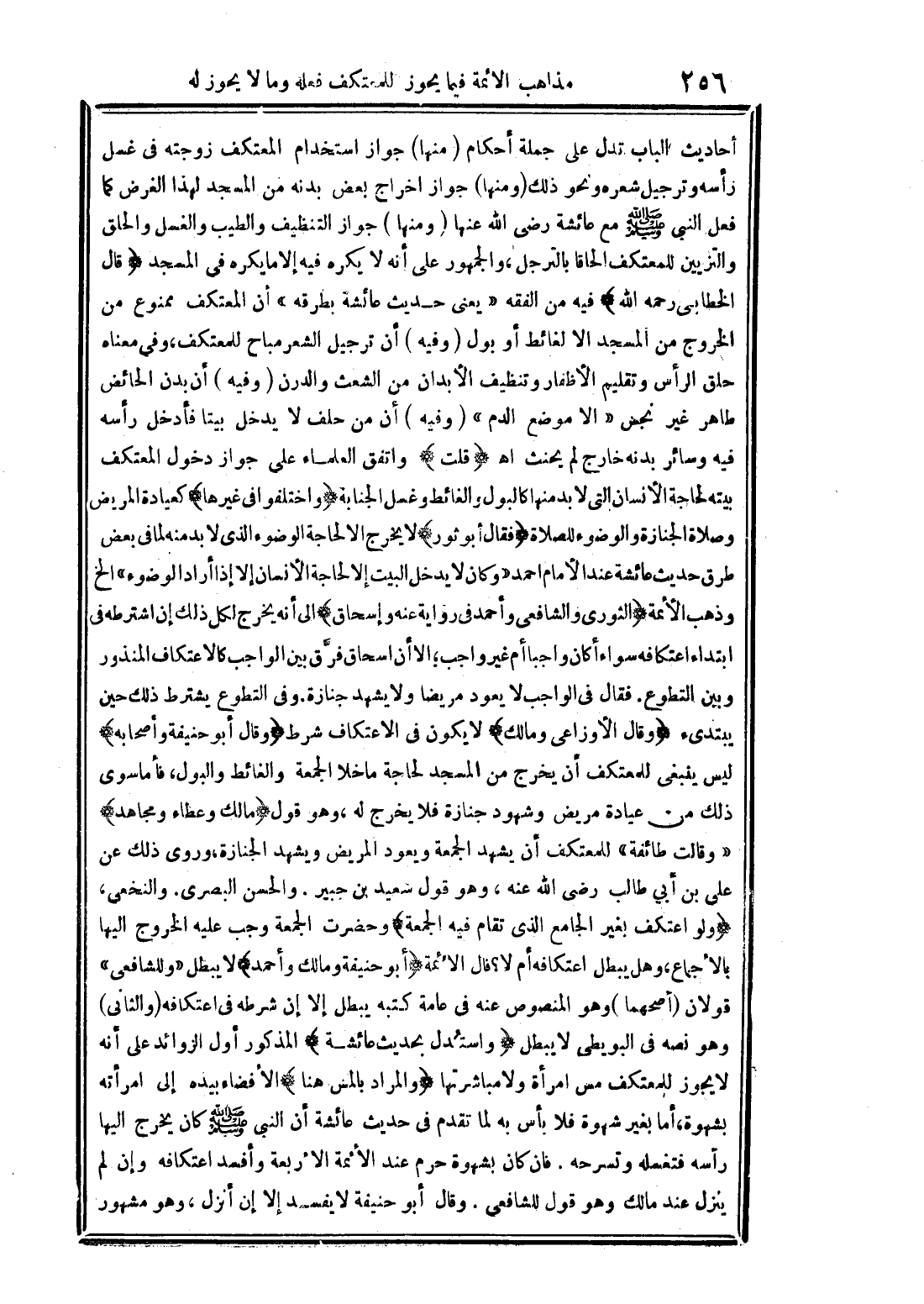 أحاديث الباب تدل على جملة أحكام (منها) جواز استخدام المعتكف زوجته في غسل رأسه ترجيل شعره ونحو ذلك (ومنها) جواز التنظيف والطيب والغسل والحلق والتزيين للمعتكف الحاقًا بالترجل، والجمهور على أنه لا يكره فيه إلا ما يكره في المسجد (قال الخطابي رحمه الله) فيه من الفقه "يعني حديث عائشة بطرقه" أن المعتكف ممنوع من الخروج من المسجد إلا لغائط أو بول (وفيه) أن ترجيل الشعر مباح للمعتكف، وفي معناه حلق الرأس وتقليم الأظفار وتنظيف الأبدان من الشعث والدرن (وفيه) أن بدن الحائض طاهر غير نجس "إلا موضع الدم" (وفيه) أن من حلف لا يدخل بيتًا فأدخل رأسه فيه وسائر بدنه خارج لم يحنث اهـ (قلت) واتفق العلماء على جواز دخول المعتكف بيته لحاجة الإنسان التي لابد منها كالبول والغائط وغسل الجنابة (واختلفوا في غيرها) كعيادة المريض وصلاة الجنازة والوضوء للصلاة (فقال أبو ثور) لا يخرج إلا لحاجة الوضوء الذي لابد منه لما في بعض طرق حديث عائشة عند الإمام أحمد "وكان لا يدخل البيت إلا لحاجة الإنسان إلا إذا أراد الوضوء" الخ وذهب الأئمة (الثوري والشافعي وأحمد في رواية عنه وإسحاق) إلى أنه يخرج لكل ذلك إن اشترطه في ابتداء اعتكافه سواء أكان واجبًا أم غير واجب؛ إلا أن اسحاق فرق بين الواجب كالاعتكاف المنذور وبين التطوع. فقال في الواجب لا يعود مريضًا ولا يشهد جنازة. وفي التطوع يشترط ذلك حين يبتدئ (وقال الأوزاعي ومالك) لا يكون في الاعتكاف شرطًا (وقال أبو حنيفة وأصحابه) ليس ينبغي للمعتكف أن يخرج من المسجد لحاجة ما خلا الجمعة والغائط والبول، فأما سوي ذلك من عيادة مريض وشهود جنازة فلا يخرج له، وهو قول (مالك وعطاء ومجاهد) "وقالت طائفة" للمعتكف أن يشهد الجمعة ويعود المريض ويشهد الجنازة، وروى ذلك عن علي بن أبي طالب رضي الله عنه، وهو قول سعيد بن جبير. والحسن البصري. والنخعي، (ولو اعتكف بغير الجامع الذي تقام فيه الجمعة) وحضرت الجمعة وجب عليه الخروج إليها بالإجماع، وهل يبطل اعتكافه أم لا؟ قال الأئمة (أبو حنيفة ومالك وأحمد) لا يبطل "وللشافعي" قولان (أصحهما) وهو المنصوص عنه في عامة كتبه يبطل إلا إن شرطه في اعتكافه (والثاني) وهو نصه في البويطي لا يبطل (واستدل بحديث عائشة) المذكور أول الزوائد على أنه لا يجوز للمعتكف مس امرأة ولا مباشرتها (والمراد بالمس هنا) الإفضاء بيده إلى امرأته بشهوة، أما بغير شهوة فلا بأس به لما تقدم في حديث عائشة أن النبي صلى الله عليه وسلم كان يخرج إليها رأسه فتغسله وتسرحه. فإن كان بشهوة حرم عند الأئمة الأربعة وأفسد اعتكافه وإن لم ينزل عند مالك وهو قول للشافعي. وقال أبو حنيفة لا يفسد إلا إن أنزل، وهو مشهور