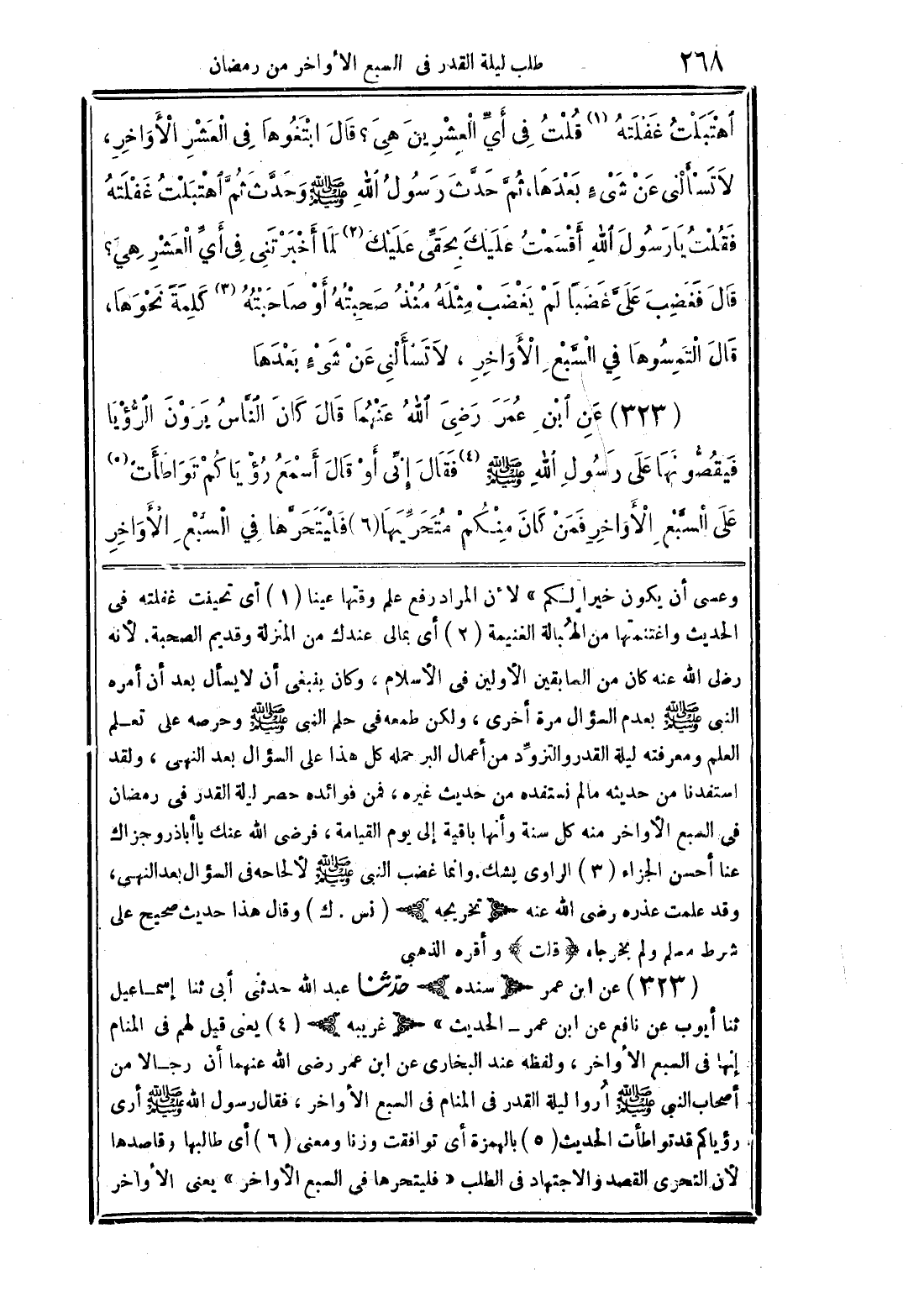 (323) عن ابن عمر (نده) حدثنا عبد الله حدثنى أبى ثنا إسماعيل ثنا أيوب عن نافع عن ابن عمر - الحديث (غريبه) (4) يعنى قيل لهم في المنام إنها في السبع الأواخر, ولفظه عند البخارى عن ابن عمر رضى الله عنهما أن رجالا من أصحاب النبى صلى الله عليه وسلم اُروا ليلة القدر في المنام في السبع الأواخر, فقال رسول الله صلى الله عليه وسلم أرى رؤياكم قد تواطأت الحديث (5) بالهمزة أى توافقت وزنا ومعنى (6) أى طالبها وقاصدها لأن التحرى القصد والاجتهاد في الطلب"فليتحرها في السبع الأواخر" يعني الأواخر