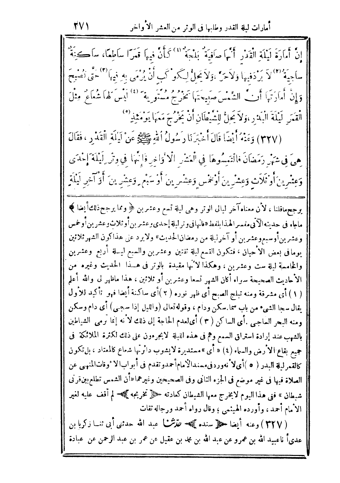 (1) أي مشرقة ومنه تبلج أي ظهر نوره (2) أي ساكنة أيضًا فهو تأكيد للأول يقال سجا الشيء من باب سمد سكن ودام، وقوله تعالى {والليل إذا سجى} أي دام وسكن ومنه البحر الساجي. أي الساكن (3) لعدم الحاجة إلى ذلك لأنه إنما ترمي الشياطين بالشهب عند إرادة استراق السمع وهم في هذه الليلة لا يجرءون على ذلك لكثرة الملائكة في جميع بقاع الأرض والسماء (4) "أي" مستديرة لا يشوب دائرتها شعاع كالمعتاد، بل تكون كالقمر ليلة البدر (5) أي لأنه ورد في مسند الإمام أحمد وتقدم في أبواب الأوقات المنهي عن الصلاة فيها في غير موضع في الجزء الثاني وفي الصحيحين وغيرهما "أن الشمس تطلع بين قرني شيطان" ففي هذا اليوم لا يخرج معها الشيطان كعادته (تخريجه) لم أقف عليه لغير الإمام أحمد، وأورده الهيثمي، وقال رواه أحمد ورجاله ثقات.