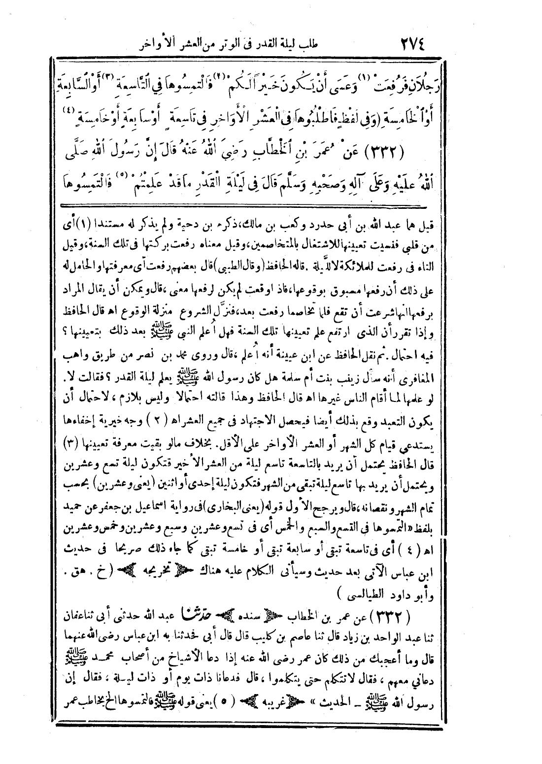 (332) عن عُمر ين الخطَّب رضى الله عنهُ قال إن رسُول الله صلى الله عليه وعلى آله وصحبه وسلَّم قال فى ليلة القدر ما قد علمتُم فالتمسُوها
