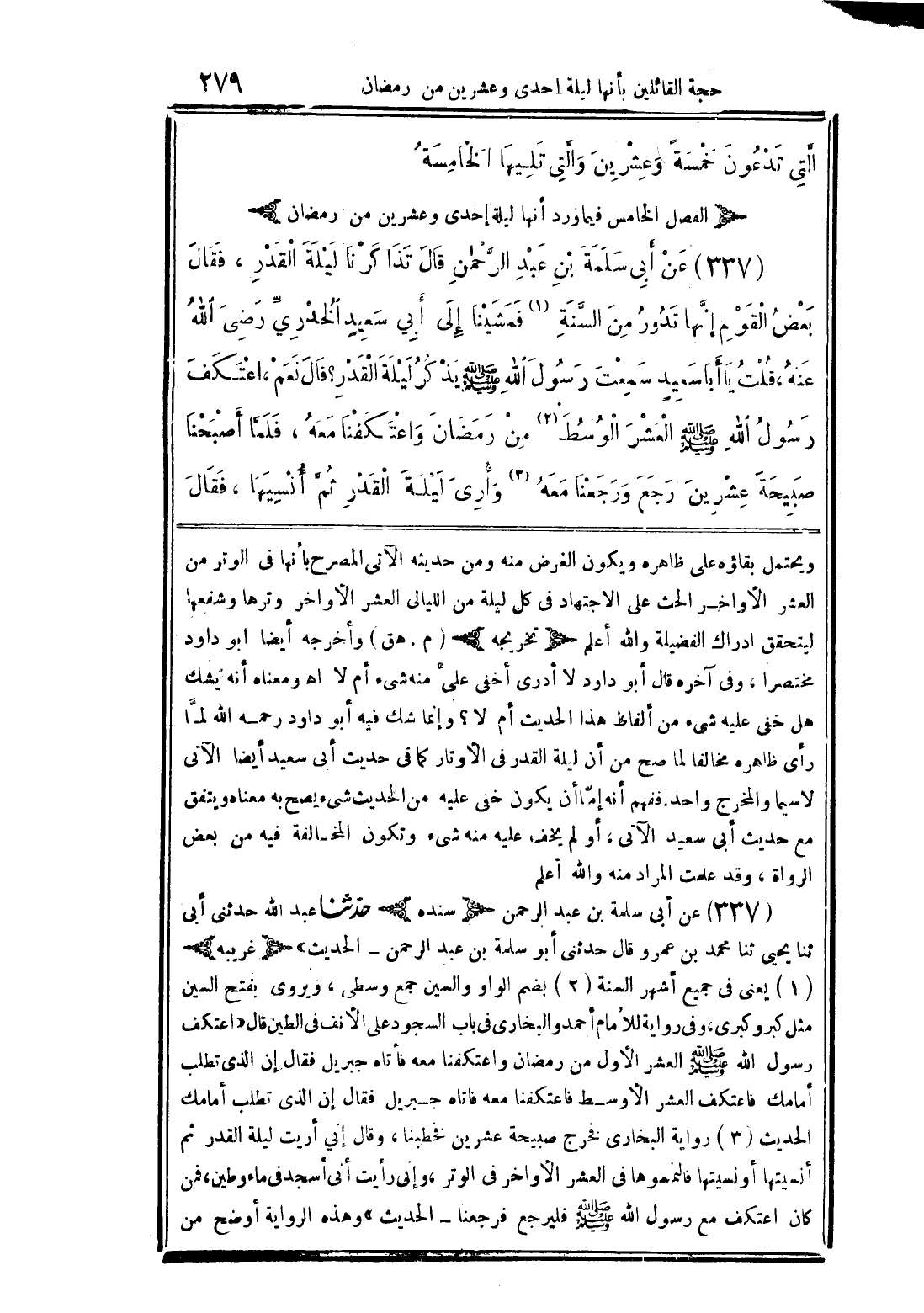 (337) عن أبى سلمة بن عبد الرحمن قال تذاكرنا ليلة القدر، فقال بعض القوم إنَّها تدُور من السَّنة فمشينا إلى أبى سعيد الخُدرىِّ رضى الله عنهُ قُلتُ يا أبا سعيد سمعت رسُول الله صلى الله عليه وسلم العشر الوسُط من رمضان واعتكفنا معهُ، فلمَّا أصبحنا صبيحة عشرين رجع ورجعنا معهُ وأرى ليلة القدر ثُمَّ أنسيها فقال