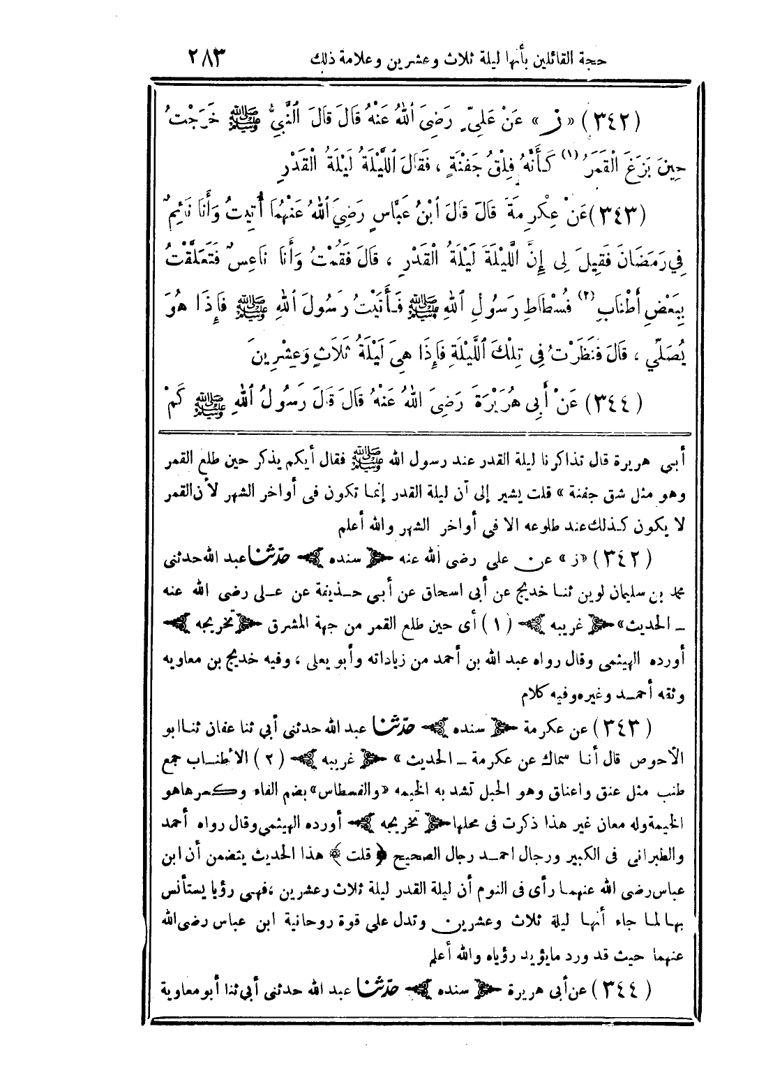 (342) (ز) عن علي رضى الله عنهُ قال قال النَّبى َّ صلَّى الله عليه وسلم خرجتُ حين بزغ القمرُ كأنه فلقُ جفنةٍ، فقال اللَّيلةُ ليلة القدر
