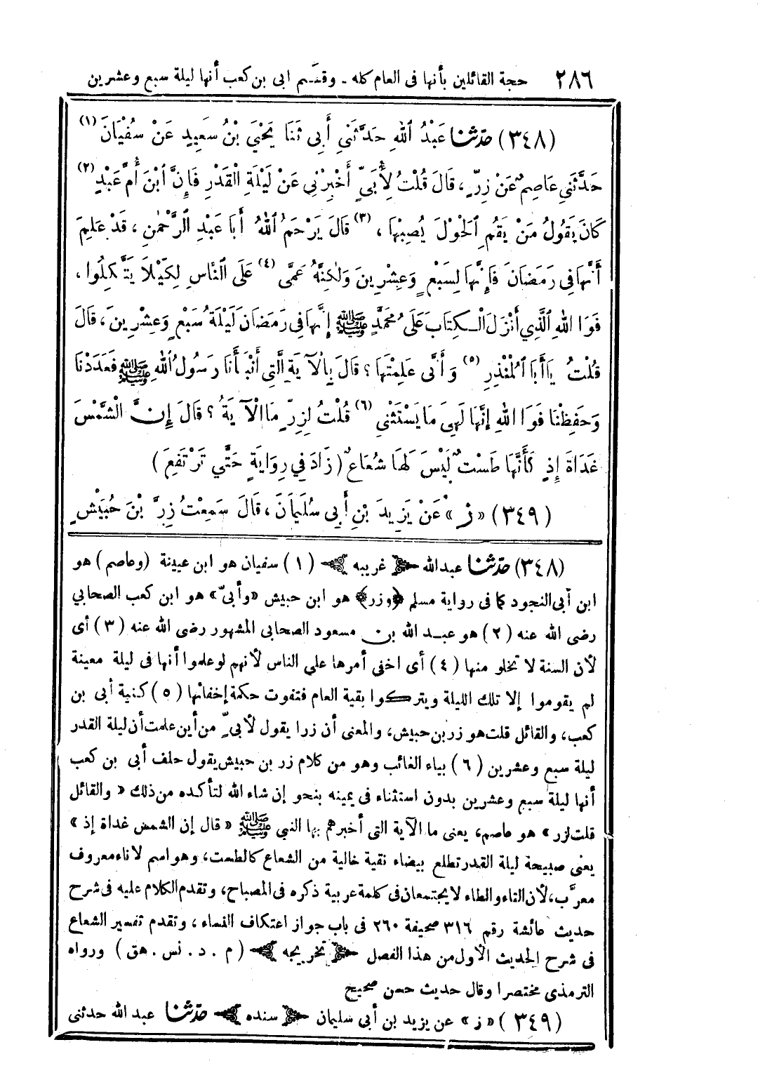 (348) حدثنا عبدُ الله حدَّثنى أبى ثنا يحيى بنُ سعيٍد عن سُفيان حدَّثنى عاصم عن رزّ، قال قُلتُ لأبى أخبرنى عن ليلة القدر فإنَّ ابن أمّ عبد كان يقُولُ من يقُم الحول يُصبها، قال يرحمُ اللهُ أبا عبد الرَّحمن، قد علم أنَّها فى رمضان فإنَّها لسبع وعشرين ولكنَّهُ عمَّى على الناس لكيلا يتَّكلوا، فوا الله الذي أنزل الكتاب على مُحمد صلى الله عليه وسلم إنَّها فى رمضان ليلة سبع وعشرين، قال قُلتُ يا أبا المُنذر وأنَّى علمتها؟ قال بالآية الَّتى أنبأنا رسُولُ الله صلى الله عليه وسلم فعددنا وحفظنا فو الله إنَّها لهى ما يستثنى قُلتُ لزر ما الآيةُ؟ قال إنَّ الشمس غداة إذ كأنَّها طست ليس لها شُعاع (زاد في رواية حتَّى ترتفع)