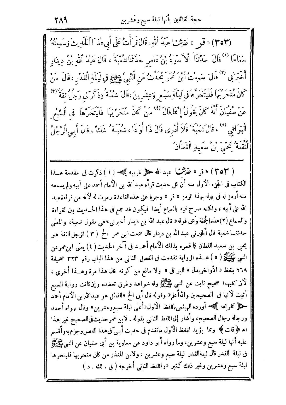 (353) "قر" حدثنا عبدُ الله، قال قرأتُ على أبى هذا الحديث وسمعتهُ سماعا قال حدثنا الأسودُ بنُ عامر حدَّثنا شُعبةُ، قال عبدُ الله بنُ دينار أخبرنى قال سمعتُ ابن عُمر يحدثُ عن النبىَّ صلى الله عليه وسلم فى ليلة القدر، قال من كان مُتحرِّيها فليتحرَّها فى ليلة سبع وعشرين، قال شُعبة وذكر لى رجُل ثقة عن سُفيان أنَّه كان يقُولُ إنها قال من كان مُتجرَّيها فليتحرها فى السَّبع البواقي، قال شُعبةُ فلا أدرى قال ذا او ذا شُعبةُ شكَّ، قال أبى الرَّجُلُ الثقةُ يحيي بن سعيد القطَّانُ