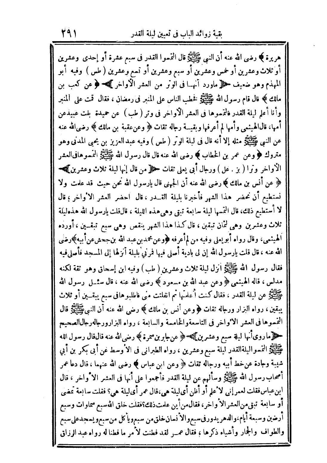 هريرة) رضي الله عنه أن النبى صلى الله عليه وسلم قال التمسوا القدر فى سبع عشرة أو إحدى وعشرين أو ثلاث وعشرين أو خمس وعشرين أو سبع وعشرين أو تسع وعشرين (طس) وفيه أبو المهذم وهو ضعيف (ماورد أنها فى الوتر من العشر الأواخر) (عن كعب بن مالك) قال قام رسول الله صلى الله عليه وسلم فخطب الناس على المنبر فى رمضان، فقال قمت على المنبر وأنا أعلى ليلة القدر فالتمسوها فى العشر الأواخر فى وتر (طب) عن حميدة بنت عبيد عن أمها، قال الهيثمى ومها لم أعرفها وبقية رجاله ثقاب (وعن عقبة بن مالك) رضى الله عنه عن النبى صلى الله عليه وسلم مثله إلا أنه قال فى ليلة الوتر (طس) وفيه عبد العزيز بن يحيى المدنى وهو متروك (وعن عمر بن الخطاب) رضى الله عنه قال قال رسول الله عليه وسلم التمسوها فى العشر الأواخر وترا (بز. عل) ورجال أبى يعلى ثقات (من قال إنها ليلة ثلاث وعشرين) (عن أنس بن مالك) رضى الله عنه أن الجهنى قال يا رسول الله نحن حيث قد علمت ولا نستطيع أن نحضر هذا الشهر فأخبرنا بليلة القدر، قال احضر العشر الأواخر، قال لا أستطيع ذلك، قال التمسها ليلة سابعة تبقى وهى هذه الليلة، قال قلت يا رسول الله هذه ليلة ثلاث وعشرين وهى لثمان تبقين، قال كذا هذا الشهر ينقص وهى سبع تبقين، أورده الهيثمى، وقال رواه أبو يعلى وفيه من لم أعرفه (وعن محمد بن عبد الله بن جحش عن أبيه) رضى الله عنه، قال قلت يا رسول الله إن لى بادية أصلى فيها فمرني بليلة أنزلها إلى المسجد فأصلى فيه فقال رسول الله صلى الله عليه وسلم انزل ليلة ثلاث وعشرين (طب) وفيه ابن إسحاق وهو ثقة لكنه مدلس، قاله الهيثمى (وعن عبد الله بن مسعود) رضى الله عنه، قال سئل رسول الله صلى الله عليه وسلم عن ليلة القدر، فقال كنت أُعلمتها ثم انفلتت منى فاطلبوها فى سبع يقين أو ثلاث يبقين، رواه البزار ورجاله ثقات (وعن أنس بن مالك) رضى الله عنه أن النبى صلى الله عليه وسلم قال التمسوها فى العشر الأواخر فى التاسعة والخامسة والسابعة، رواه البزار ورجاله رجال الصحيح (ما روى أنها ليلة سبع وعشرين) (عن جابر بن سمرة) رضى الله عنه قال قال رسول الله صلى الله عليه وسلم التمسوا ليلة القدر ليلة سبع وعشرين، روه الطبرنى فى الأوسط عن أبى بكر بن أبى شيبة وجادة عن خط أبيه ورجاله ثقات (وعن ابن عباس) رضى الله عنهما، قال دعا عمر أصحاب رسول الله صلى الله عليه وسلم وسألهم عن ليلة القدر فأجمعوا على أنها فى العشر الأواخر، قال ابن عباس فقلت لعمرانى لأعلم أو أظن أى ليلة هى، قال عمر أى ليلة هى؟ فقلت سابة تمضى أو سابة تبقى من العشر الأواخر، فقال من أين علمت ذلك؟ فقلت خلق الله سبع سماوات وسبع أرضين وسبع والطواف والجمار وأشياء ذكرها، فقال عمر لقد فطنت لامر ما فطنا له رواه عبد الرزاق