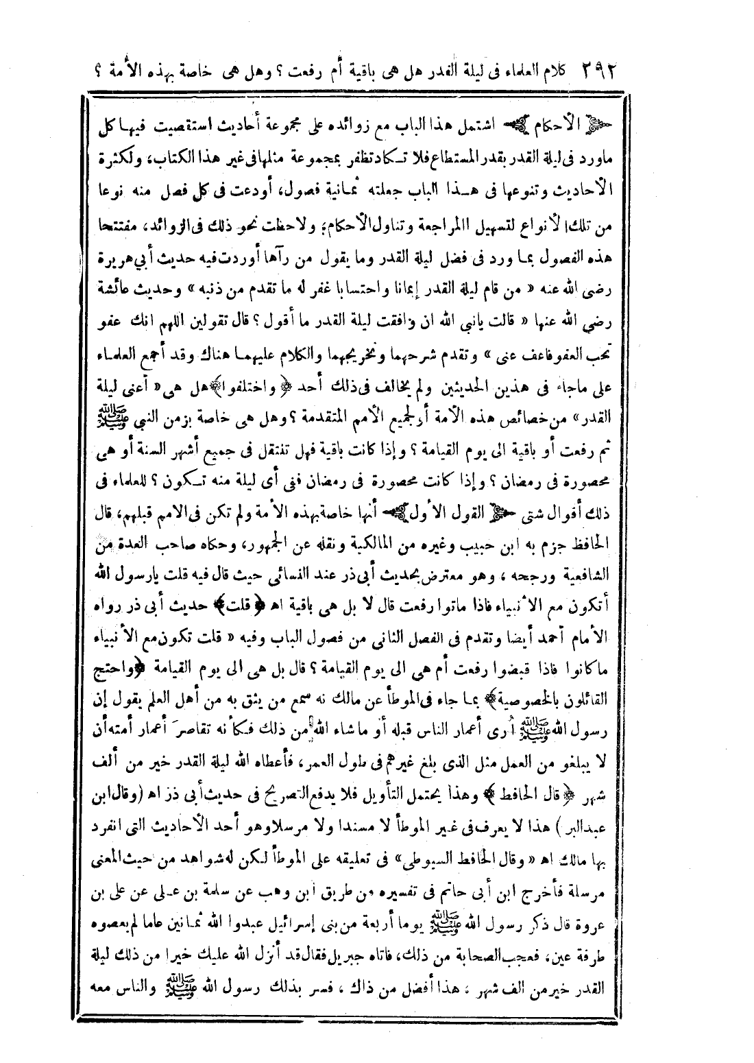 (الأحكام) اشتمل هذا الباب مع زوائده على مجموعة أحاديث استقصيت فيها كل ما ورد فى ليلة القدر بقدر المستطاع فلا تكاد تظفر بمجموعة مثلها فى غير هذا الكتاب، ولكثرة الأحاديث وتنوعها فى هذا الباب جعلته ثمانية فصول، أودعت فى كل فصل منه نوعا من تلك الأنواع لتسهيل المراجعة وتناول الأحكام، ولاحظت نحو ذلك فى الزوائد، مفتتحا هذه الفصول بما ورد فى فضل ليلة القدر وما يقول من رآها أوردت فيه حديث أبي هريرة رضى الله عنه (من قام ليلة القدر إيمانا واحتسابا غفر له ما تقدم من ذنبه) وحديث عائشة رضي الله عنها (قالت يا نبي الله ان وافقت ليلة القدر ما أقول؟ قال تقولين اللهم انك عفو تحب العفو فاعف عنى) وتقدم شرحهما وتخريجهما والكلام عليهما هناك وقد أجمع العلماء على ما جاء فى هذين الحديثين ولم يخالف فى ذلك أحد (واختلفوا) هل هى (آعنى ليلة القدر) من خصائص هذه الأمة أو لجميع الأمم المتقدمة؟ وهل هى خاصة بزمن النبى صلى الله عليه وسلم ثم رفعت أو باقية إلى يوم القيامة؟ وإذا كانت باقية فهل تنتقل فى جميع أشهر السنة أو هى محصورة فى رمضان؟ وإذا كانت محصورة فى رمضان ففى أى ليلة منه تكون؟ للعلماء فى ذلك أقوال شتى (القول الأول) أنها خاصة بهذه الأمة ولم تكن فى الأمم قبلهم، قال الحافظ جزم به ابن حبيب وغيره من المالكية ونقله عن الجمهور، وحكاه صاحب العدة من الشافعية ورجحه، وهو معترض بحديث أبى ذر عند النسائى حيث قال فيه قلت يا رسول الله أتكون مع الأنبياء فإذا ماتوا رفعت قال لا بل هى باقية اهـ (قلت) حديث أبى ذر رواه الأمام أحمد أيضا وتقدم فى الفصل الثانى من فصول الباب وفيه (قلت تكون مع الأنبياء ما كانوا فإذا قبضوا رفعت أم هى إلى يوم القيامة؟ قال بل هى إلى يوم القيامة (واحتج القائلون بالخصوصية) بما جاء فى الموطأ عن مالك أنه سمع من يثق به من أهل العلم يقول إن لا يبلغوا من العمل مثل الذى بلغ غيرهم فى طول العمر، فأعطاه الله ليلة القدر خير من ألف شهر (قال الحافظ) وهذا يحتمل التأويل فلا يدفع التصريح فى حديث أبى ذر اهـ (وقال ابن عبد البر) هذا لا يعرف فى غير الموطأ لا مسندا ولا مرسلا وهو أحد الأحاديث التى انفرد بها مالك اهـ (وقال الحافط السيوطى) فى تعليقه على الموطأ لكن له شواهد من حيث المعنى مرسلة فأخرج ابن أبى حاتم فى تفسيره من طريق ابن وهب عن سلمة بن على عن على بن عروة قال ذكر رسول الله صلى الله عليه وسلم يوما أربعة من بنى إسرائيل عبدوا الله ثمانين عاما لم بمصوه طرفة عين، فعجب الصحابة من ذلك، فاتاه جبريل فقال قد أنزل الله عليك خيرا من ذلك ليلة القدر خير من ألف شهر، هذا أفضل من ذاك، فسر بذلك رسول الله صلى الله عليه وسلم والناس معه