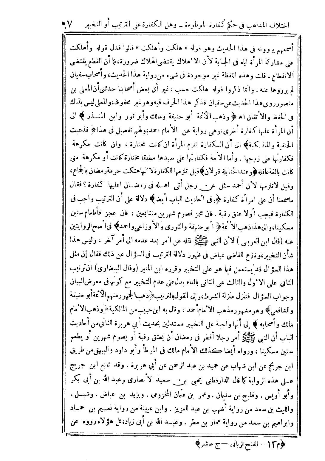 أسمعهم يروونه في هذا الحديث وهو قوله"هلكت واهلكت" قالوا فدل قوله وأهلكت على مشاركة المراة اياه في الجنابة لأن الأهلاك يقتضي الهلاك ضرورة, كما ان القطع يقتضي الانقطاع, قلت وهذه اللفظة غير موجودة في شيء من رواية هذا الحديث, وأصحاب سفيان لم يرووها عنه, وانما ذكروا قوله هلكت حسب, غير ان بعض اصحابنا حدثنى ان المعلى بن منصور روى هذا الحديث عن سفيان فذكر هذا الحرف فيه وهو غير محفوظ, والمعلى ليس بذاك في الحفظ والإتقان اهـ (وذهب الأئمة أبو حنيفة ومالك وأبو ثور وابن المنذر) الى ان المراة عليها كفارة اخرى, وهى رواية عن الإمام احمد, ولهم تفصيل في هذا (فذهبت الحانفية والمالكية) الى ان الكفارة تلزم المرأة ان كانت مختارة, وان كلنت مكرهة فكفارتها على زوجها. وأما الأمة فكفارتها على سيدها مطلقا مختارة كانت او مكرهة متى كانت بالغة عاقلة (وعند الحنابلة قولان) قيل تلزمها الكفارة لأنها هتكت حرمة رمضان بالجماع, وقيل لا تلزمها لأن احمد سئل عن رجل اتى اهله في رمضان اعليها كفارة؟ فقال ما سمعنا ان على امراة كفارة (وفي احاديث الباب ايضاً) دلالة على ان الترتيب واجب في الكفارة فيجب اولاً عتق رقبة. فان عجز فصوم شهرين متتابعين, فان عجز فاطعام ستين مسكيناً, والى هذا ذهب الأئمة (ابو حنيفة والنورى والأوزاعى واحمد) في اصح الروايتين عنه (قال ابن العربى) لأن النبي صلى الله عليه وسلم نقله عن امر بعد عدمه الى امر آخر, وليس هذا شأن التخبير, ونازع القاضي عياض في ظهور دلالة الترتيب في السؤال عن ذلك فقال ان مثل هذا السؤال قد يستعمل فيما هو على التخبير وقرره ابن المنير (وقال البيضاوى) ان ترتيب الثانى على الأول والثالث على الثانى بالفاء يدل على عدم التخبير من كونها في معرض البيان وجواب السؤال فتنزل منزلة الشرط, والى القول بالترتيب (ذهب الجمهور منهم الأئمة ابو حنيفة والشافعى) وهو مشهور مذهب الإمام احمد, وقال به ابن حبيب من المالكية (وذهب الإمام مالك وأصحابه) الى انها واجبة على التخبير مستدلين بحديث ابى هريرة الثانى من احاديث الباب ان النبي صلى الله عليه وسلم أمر رجلا افطر في رمضان ان يعتق رقبة او يصوم شهرين او يطعم ستين مسكينا, ورواه ايضا كذلك الإمام مالك في الموطأ وابو داود والبيهقي من طريق ابن جريج عن ابن شهاب عن حميد بن عبد الرحمن عن ابى هريرة. زقد تابع ابن جريج على هذه الرواية كما قال الدارقطني يحيى بن سعيد الأنصارى وعبد الله بن ابى بكر وابو اويس. وفليح بن سليمان. وعمر بن عثمان المخزومى. ويزيد بن عياض. وشبل, والليث بن سعد من رواية أشهب بن عبد العزيز. وابن عيينة من رواية نعيم بن حماد وابراهيم بن سعد من رواية عمار بن مطر. وعبد الله بن ابى زياد, كل هؤلاء رووه عن