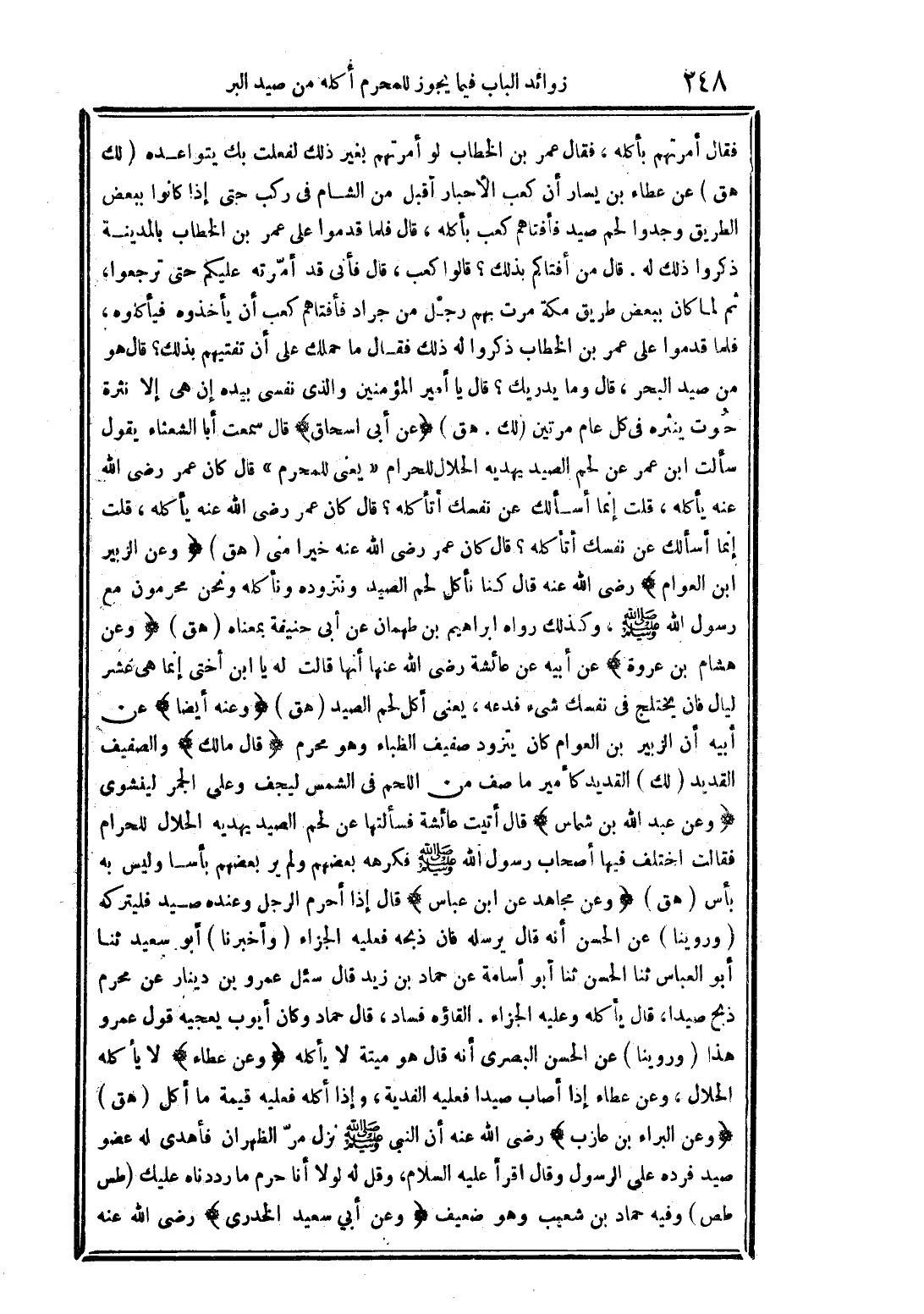 فقال أمرتهم بأكله، فقال عمر بن الخطاب لو أمرتهم بغير ذلك لفعلت بك يتواعده (لك هق) عن عطاء بن يسار أن كعب الأحبار أقبل من الشام فى ركب حتى إذا كانوا ببعض الطريق وجدوا لحم صيد فأفتاهم كعب بأكله، قال فلما قدموا على عمر بن الخطاب بالمدينة ذكروا ذلك له. قال من أفتاكم بذلك؟ قالوا كعب، قال فأنى قد أمّرته عليكم حتى ترجعوا، ثم لما كان ببعض طريق مكة مرت بهم رجل من جراد فأفتاهم كعب أن يأخذوه فيأكلوه، فلما قدموا على عمر بن الخطاب ذكروا له ذلك فقال ما حملك على أن تفتيهم بذلك؟ قال هو من صيد البحر، قال وما يدريك؟ قال يا أمير المؤمنين والذى نفسى بيده إن هى إلا نثرة حوت ينثره فى كل عام مرتين (لك. هق) (عن أبى اسحاق) قال سمعت أبا الشعثاء يقول سألت ابن عمر عن لحم الصيد يهديه الحلال للحرام "يعنى للمحرم" قال كان عمر رضى الله عنه يأكله، قلت إنما أسألك عن نفسك أتأكله؟ قال كان عمر رضى الله عنه يأكله، قلت إنما أسألك عن نفسك أتأكله؟ قال كان عمر رضى الله عنه خيرا منى (هق) (وعن زبير ابن العوام) رضى الله عنه قال كنا نأكل لحم الصيد ونتزوده ونأكله ونحن محرمون مع رسول الله صلى الله عليه وسلم، وكذلك رواه ابراهيم بن طهمان عن أبى حنيفة بمعناه (هق) (وعن هشام بن عروة) عن أبيه عن عائشة رضى الله عنها أنها قالت له يا ابن أختى إنما هى عشر ليال فان يختلج فى نفسك شيء فدعه، يعنى أكل لحم الصيد (هق) (وعنه أيضا) عن أبيه أن الزبير بن العوام كان يتزود صفيف الظباء وهو محرم (قال مالك) والصفيف القديد (لك) القديد كأمير ما صف من اللحم فى الشمس ليجف وعلى الجمر لينشوى (وعن عبد الله بن شماس) قال أتيت عائشة فسألتها عن لحم الصيد يهديه الحلال للحرام فقالت اختلف فيها أصحاب رسول الله صلى الله عليه وسلم فكرهه بعضهم ولم ير بعضهم بأسا وليس به بأس (هق) (وعن مجاهد عن ابن عباس) قال إذا أحرم الرجل وعنده صيد فليتركه (وروينا) عن الحسن أنه قال يرسله فان ذبحه فعليه الجزاء (وأخبرنا) أبو سعيد ثنا أبو العباس ثنا الحسن ثنا أبو أسامة عن حماد بن زيد قال سئل عمرو بن دينار عن محرم ذبح صيدا، قال يأكله وعليه الجزاء. القاؤه فساد، قال حماد وكان أيوب يعجيه قول عمرو هذا (وروينا) عن الحسن البصرى أنه قال هو ميتة لا يأكله (وعن عطاء) لا يأكله الحلال، وعن عطاء إذا أصاب صيدا فعليه الفدية، وإذا أكله فعليه قيمة ما أكل (هق) (وعن البراء بن عازب) رضى الله عنه أن النبى صلى الله عليه وسلم نزل مرّ الظهران فأهدى له عضو صيد فرده على الرسول وقال اقرأ عليه السلام، وقل له لولا أنا أحرم ما رددناه عليك (طس طص) وفيه حماد بن شعيب وهو ضعيف (وعن أبى سعيد الخدري) رضي الله عنه