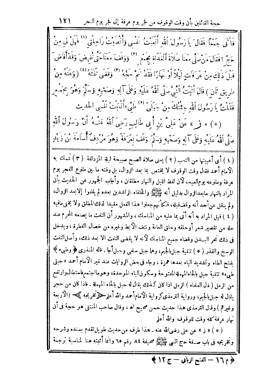 (*) ((ز)) على علىَّ بن أبى طالبٍ رضى الله عنه أنَّ رسول الله صلَّى الله عليه وعلى آله وصحبه وسلَّم وقف بعرفة وهو مردفٌ أسامة بن زيدٍ
