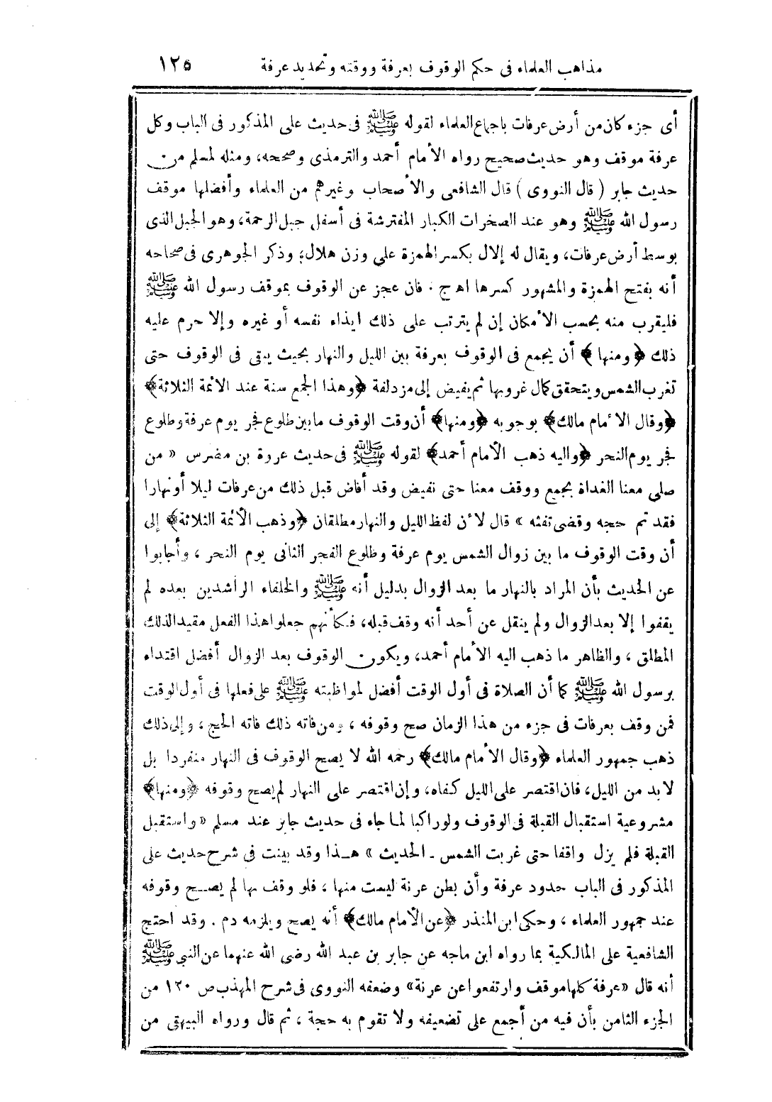 أي جزء كان من أرض عرفات باجماع العلماء لقوله صلى الله عليه وسلم فى حديث على المذكور فى الباب وكل عرفة موقف وهو حديث صحيح رواه الأمام أحمد والترمذى وصححه، ومثله لمسلم من حديث جابر (قال النووى) قال الشافعى والأصحاب وغيرهم من العلماء وأفضلها موقف رسول الله صلى الله عليه وسلم وهو عند الصخرات الكبار المفترشة فى أسفل جبل الرحمة، وهو الجبل الذى بوسط أرض عرفات، ويقال له إلال بكسر الهمزة على وزن هلال؛ وذكر الجوهرى فى صحاحه أنه بفتح الهمزة والمشهور كسرها اهـ ج. فان عجز عن الوقوف بموقف رسول الله صلى الله عليه وسلم فليقرب منه بحسب الأمكان إن لم يترتب على ذلك ايذاء نفسه أو غيره وإلا حرم عليه ذلك (ومنها) أن يجمع فى الوقوف بعرفة بين الليل والنهار بحيث يبقى فى الوقوف حتى تغرب الشمس ويتحقق كمال غروبها ثم يفيض إلى مزدلفة (وهذا الجمع سنة عند الأئمة الثلاثة) (وقال الأمام مالك) بوجوبه (ومنها) أن وقت الوقوف ما بين طلوع فجر يوم عرفة وطلوع فجر يوم النحر (واليه ذهب الأمام أحمد) لقوله صلى الله عليه وسلم فى حديث عروة بن مضرس ((من صلى معنا الغداة بجميع ووقف معنا حتى نفيض وقد أفاض قبل ذلك من عرفات ليلًا أو نهارًا فقد تم حجه وقضى تفثه)) قال لأن لفظ الليل والنهار مطلقان (وذهب الأئمة الثلاثة) إلى أن وقت الوقوف ما بين زوال الشمس يوم عرفة وطلوع الفجر الثانى يوم النحر، وأجابوا عن الحديث بأن المراد بالنهار ما بعد الزوال بدليل أنه صلى الله عليه وسلم والخلفاء الراشدين بعده لم يقفوا إلا بعد الزوال ولم ينقل عن أحد أنه وقف قبله، فكأنهم جعلوا هذا الفعل مقيد لذلك المطلق، والظاهر ما ذهب اليه الأمام أحمد، ويكون الوقوف بعد الزوال أفضل اقتداء برسول الله صلى الله عليه وسلم كما أن الصلاة فى أول الوقت أفضل لمواظبته صلى الله عليه وسلم على فعلها فى أول الوقت فمن وقف بعرفات فى جزء من هذا الزمان صح وقوفه، ومن فاته ذلك فاته الحج، وإلى ذلك ذهب جمهور العلماء (وقال الأمام مالك) رحمه الله لا يصح الوقوف فى النهار منفردًا بل لابد من الليل، فان اقتصر على الليل كفاه، وإن اقتصر على النهار لم يصح وقوفه (ومنها) مشروعية استقبال القبلة فى الوقوف ولو راكبًا لما جاء فى حديث جابر عند مسلم ((واستقبل القبلة فلم يزل واقفًا حتى غربت الشمس- الحديث)) هذا وقد بينت فى شرح حديث على المذكور فى الباب حدود عرفة وأن بطن عرنة ليست منها، فلو وقف بها لم يصح وقوفه عند جمهور العلماء، وحكى ابن المنذر (عن الأمام مالك) أنه يصح ويلزمه دم. وقد احتج الشافعية على المالكية بما رواه ابن ماجه عن جابر بن عبد الله رضى الله عنهما عن النبى صلى الله عليه وسلم أنه قال ((عرفة كلها موقف وارتفعوا عن عرنة)) وضعفه النووى فى شرح المهذب ص 120 من الجزء الثامن بأن فيه من أجمع على تضعيفه ولا تقوم به حجة، ثم قال ورواه البيهقي من