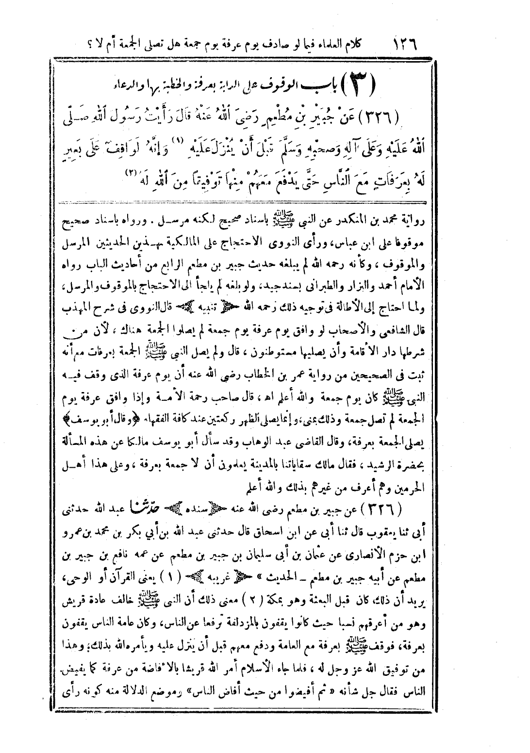 رواية محمد بن المنكدر عن النبى صلى الله عليه وسلم باسناد صحيح لكنه مرسل. ورواه باسناد صحيح موقوفًا على ابن عباس، ورأى النووى الاحتجاج على المالكية بهذين الحديثين المرسل والموقوف، وكأنه رحمه الله لم يبلغه حديث جبير بن مطعم الرابع من أحاديث الباب رواه الأمام أحمد والبزار والطبرانى بسند جيد، ولو بلغه لم يلجأ الى الاحتجاج بالموقوف والمرسل، ولما احتاج الى الطالة فى توجيه ذلك رحمه الله (تنبيه) قال النووى فى شرح المهذب قال الشافعى والأصحاب لو وافق يوم عرفة يوم جمعة لم يصلوا الجمعة هناك، لأن من شرطها دار الأقامة وأن يصليها مستوطنون، قال ولم يصل النبى صلى الله عليه وسلم الجمعة بعرفات مع أنه ثبت فى الصحيحين من رواية عمر بن الخطاب رضى الله عنه أن يوم عرفة الذى وقف فيه النبى صلى الله عليه وسلم كان يوم جمعة والله أعلم اهـ، قال صاحب رحمة الأمة وإذا وافق يوم عرفة يوم الجمعة لم تصل جمعة وذلك بمنى، وإنما يصلى الظهر ركعتين عند كافة الفقهاء (وقال أبو يوسف) يصلى الجمعة بعرفة، وقال القاضى عبد الوهاب وقد سأل أبو يوسف مالكًا عن هذه المسألة بحضرة الرشيد، فقال مالك سقاياتنا بالمدينة يعلمون أن لا جمعة بعرفة، وعلى هذا أهل الحرمين وهم أعرف من غيرهم بذلك والله أعلم