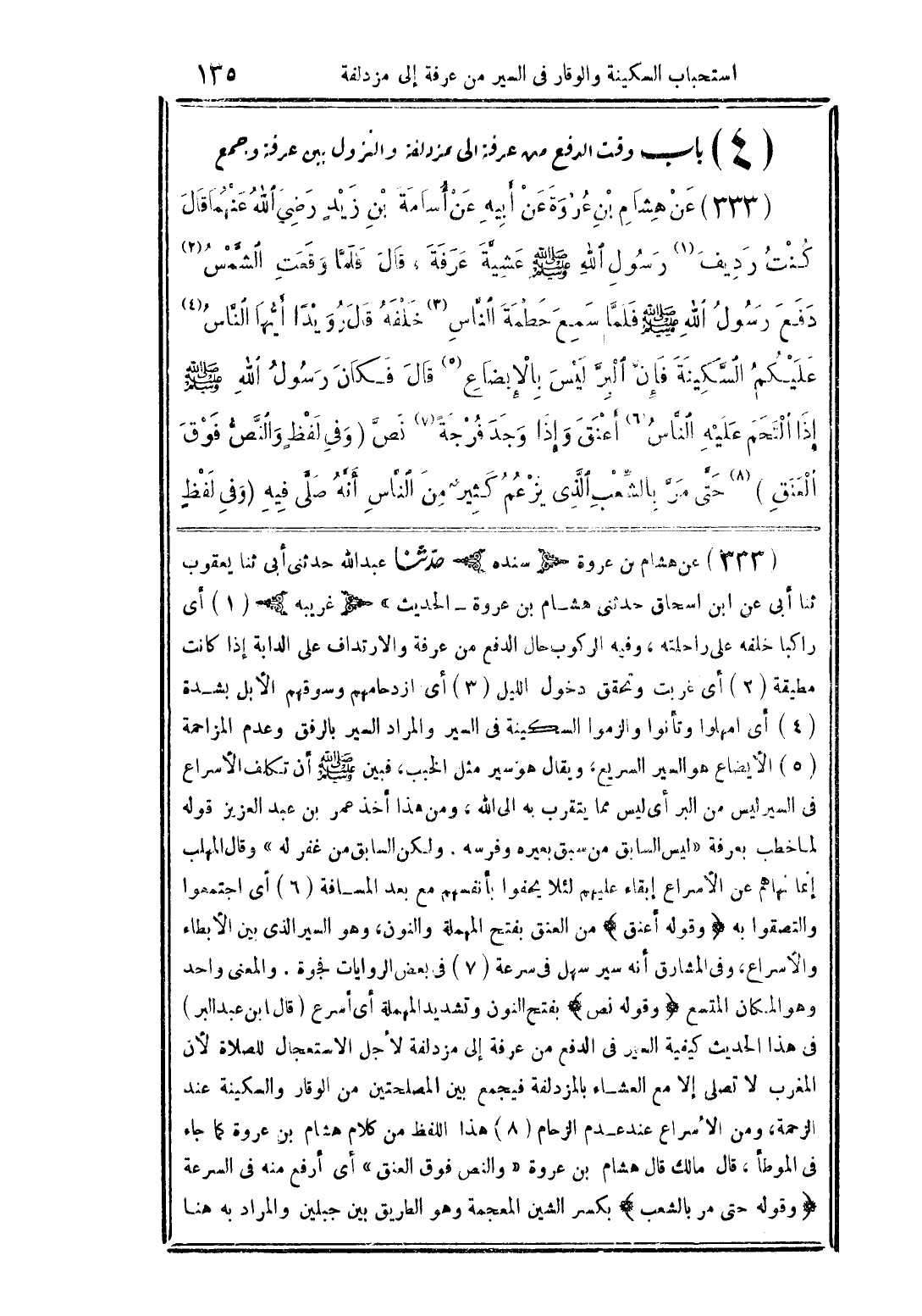 (333) عن هشام بن عروة عن أبيه عن أسامة بن زيدٍ رضى الله عنهما قال كنت رديف رسول الله صلى الله عليه وسلم عشيَّة عرفة، قال فلمَّا وقعت الشَّمس دفع رسول الله صلى الله عليه وسلم فلمَّا سمع حطمة النَّاس خلفه قال رويدًا أيُّها النَّاس عليكم السَّكينة فإن البرَّ ليس بالإبضاع قال فكان رسول الله صلى الله عليه وسلم إذا التحم عليه النَّاس أعنق وإذا وجد فرجة نصَّ (وفى لفظٍ والنَّص فوق العنق) حتى مرَّ بالشِّعب الَّذى يزعم كثيرٌ من النَّاس أنَّه صلَّى فيه (وفي لفظٍ