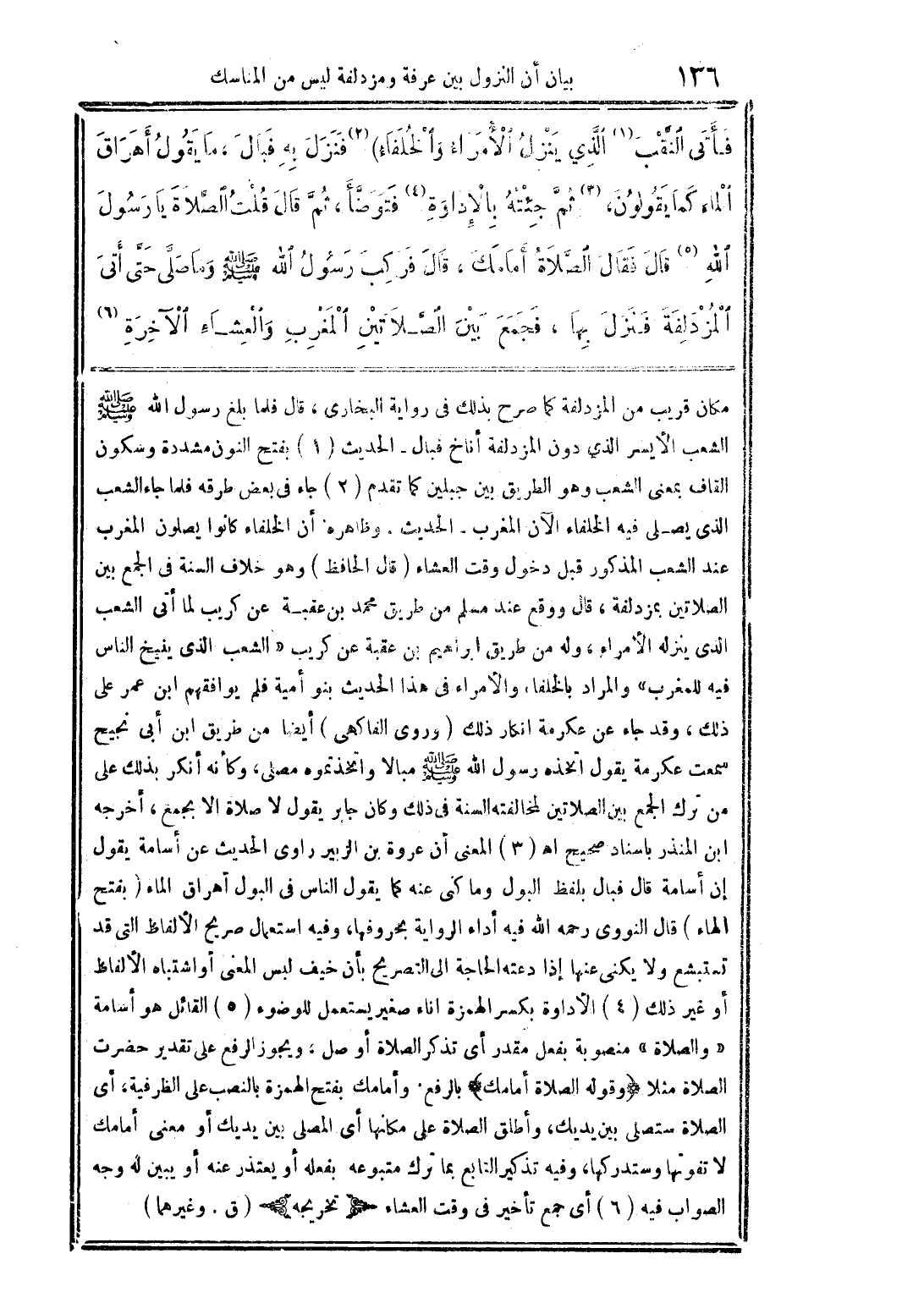 مكان قريب من المزدلفة كما صرح بذلك فى رواية البخارى، قال فلما بلغ رسول الله صلى الله عليه وسلم الشعب الأيسر الذى دون المزدلفة أناخ فبال- الحديث (1) بفتح النون مشددة وسكون القاف بمعنى الشعب وهو الطريق بين جبلين كما تقدم (2) جاء فى بعض طرقه فلما جاء الشعب الذى يصلى فيه الخلفاء الآن المغرب- الحديث. وظاهره أن الخلفاء كانوا يصلون المغرب عند الشعب المذكور قبل دخول وقت العشاء (قال الحافظ) وهو خلاف السنة فى الجمع بين الصلاتين بمزدلفة، قال ووقع عند مسلم من طريق محمد بن عقبة عن كريب لما أتى الشعب الذى ينزله الأمراء، وله من طريق ابراهيم بن عقبة عن كريب ((الشعب الذى ينيخ الناس فيه للمغرب)) والمراد بالخلفاء والأمراء فى هذا الحديث بنو أمية فلم يوافقهم ابن عمر على ذلك، وقد جاء عن عكرمة انكار ذلك (وروى الفاكهى) أيضًا من طريق ابن أبى نجيح سمعت عكرمة يقول اتخذه رسول الله صلى الله عليه وسلم مبالًا واتخذتموه مصلى، وكأنه أنكر بذلك على من ترك الجمع بين الصلاتين لمخالفته السنة فى ذلك وكان جابر يقول لا صلاة الا بجمع، أخرجه ابن المنذر باسناد صحيح اهـ (3) المعنى أن عروة بن الزبير راوى الحديث عن أسامة يقول إن أسامة قال فبال بلفظ البول وما كنى عنه كما يقول الناس فى البول أهراق الماء (بفتح الهاء) قال النووى رحمه الله فيه أداء الرواية بحروفها، وفيه استعمال صريح الألفاظ التى قد تستبشع ولا يكنى عنها إذا دعته الحاجة الى التصريح بأن خيف ليس المعنى أو اشتباه الألفاظ أو غير ذلك (4) الأداوة بكسر الهمزة اناء صغير يستعمل للوضوء (5) القائل هو أسامة ((والصلاة)) منصوبة بفعل مقدر أى تذكر الصلاة أو صل، ويجوز الرفع على تقدير حضرت الصلاة مثلًا (وقوله الصلاة أمامك) بالرفع وأمامك بفتح الهمزة بالنصب على الظرفية، أى الصلاة ستصلى بين يديك، وأطلق الصلاة على مكانها أى المصلى بين يديك أو معنى أمامك لا تفوتها وستدركها، وفيه تذكير التابع بما ترك متبوعه بفعله أو يعتذر عنه أو يبين له وجه الصواب فيه (6) أى جمع تأخير فى وقت العشاء (تخريجه) (ق. وغيرهما)