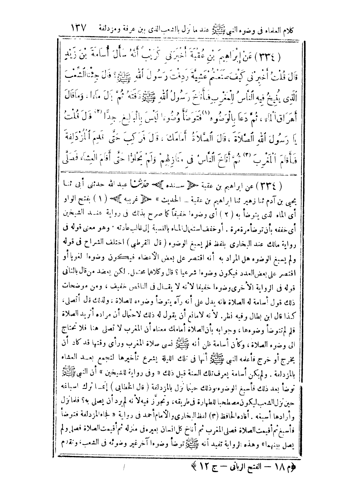 (334) عن إبراهيم بن عقبة (سنده) حدّثنا عبد الله حدثنى أبى ثنا يحيى بن آدم ثنا زهير ابراهيم بن عقبة- الحديث)) (غريبه) (1) بفتح الواو أى الماء لذى يتوضأ به (2) أى وضوءًا خفيفًا كما صرح بذلك فى رواية عند الشيخين أى خففه بأن توضأ مرة مرة. أو خفف استعمال الماء بالنسبة إلى غالب عادته. وهو معنى قوله فى رواية مالك عند البخارى بلفظ فلم يسبغ الوضوء (قال القرطبى) اختلف الشراح فى قوله ولم يسبغ الوضوء هل المراد به أنه اقتصر على بعض الأعضاء فيكون وضوءًا لغويًا أو اقتصر على بعض العدد فيكون وضوءًا شرعيًا؟ قال وكلاهما محتمل. لكن يعضد من قال بالثانى قوله فى الرواية الأخرى وضوءًا خفيفًا لأنه لا يقال فى الناقص خفيف، ومن موضحات ذلك قول أسامة له الصلاة فانه يدل على أنه رآه يتوضأ وضوءه للصلاة، ولذلك قال أتصلى، كذا قال ابن بطال وفيه نظر. لأنه لا مانع أن يقول له ذلك لاحتمال أن مراده أتريد الصلاة فلم لم تتوضأ وضوءها، وجوابه بأن الصلاة أمامك معناه أن المغرب لا تصلى هنا فلا تحتاج الى وضوء الصلاة، وكأن أسامة ظن أنه صلى الله عليه وسلم نسى صلاة المغرب ورأى وقتها قد كاد أن يخرج أو خرج فأعلمه النبى صلى الله عليه وسلم أنها فى تل الليلة يشرع تأخيرها لتجمع بعد العشاء بالمزدلفة. ولم يكن أسامة يعرف تلك السنة قبل ذلك ((وفى رواية للشيخين)) أن النبى صلى الله عليه وسلم توضأ بعد ذلك فأسبغ الوضوء وذلك حينما نزل بالمزدلفة (قال الخطابى) إنما ترك اسباغه حين نزل الشعب ليكون مصطحبًا للطهارة فى طريقه، وتجوَّز فيه لنه لم يرد أن يصلى به؟ فلما نزل وأرادها أسبغته. أفاده الحافظ (3) لفظ البخارى والأمام أحمد فى رواية ((فجاء المزدلفة فتوضأ فأسبغ ثم أقيمت الصلاة فصلى المغرب ثم أناخ كل انسان بعيره فى منزله ثم أقيمت الصلاة فصلى ولم يصل بينهما)) وهذه الرواية تفيد أنه صلى الله عليه وسلم توضأ وضوءًا آخر غير وضوئه في الشعب، ونقدم