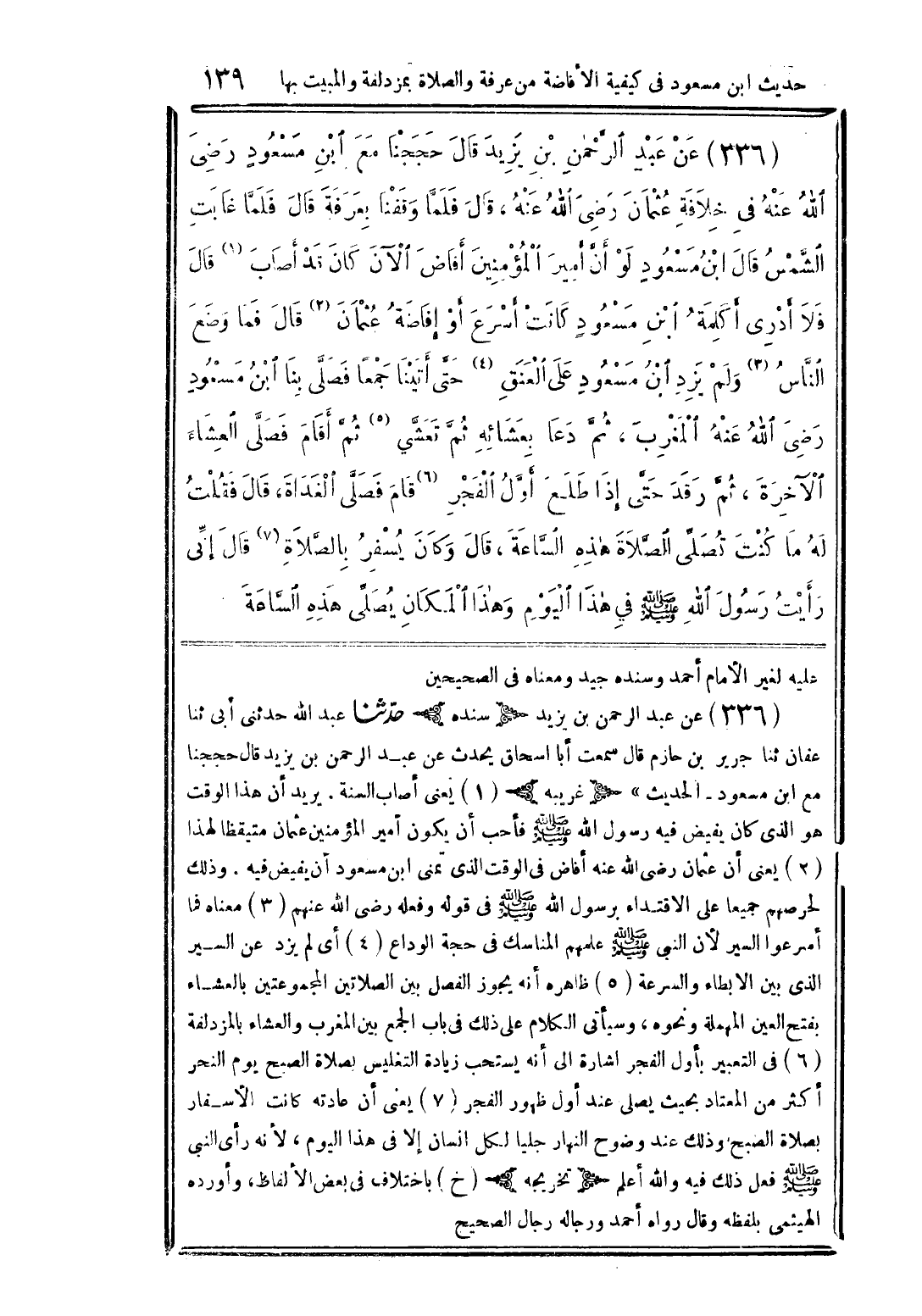 (336) عن عبد الرَّحمن بن يزيد قال حججنا مع ابن مسعودٍ رضى الله عنه فى خلافة عثمان رضى الله عنه، قال فلمَّا وقفنا بعرفة قال فلمَّا غابت الشَّمس قال ابن مسعودٍ لو أن أمير المؤمنين أفاض الآن كان قد أصاب قال فلا أدرى أكلمة ابن مسعودٍ كانت أسرع أو إفاضة عثمان قال فما وضع النَّاس ولم يزد ابن مسعودٍ على العنق حتَّى أتينا جمعًا فصلَّى بنا ابن مسعودٍ رضى الله عنه المغرب، ثمَّ دعا بعشائه ثمَّ تعشَّى ثمَّ أقام فصلَّى العشاء الآخرة، ثمَّ رقد حتَّى إذا طلع أوَّل الفجر قام فصلَّى الغداة، قال فقلت له ما كنت تصلَّى الصَّلاة هذه السَّاعة، قال وكان يسفر بالصَّلاة قال إنِّى رأيت رسول الله صلى الله عليه وسلم في هذا اليوم وهذا المكان يصلَّى هذه السَّاعة