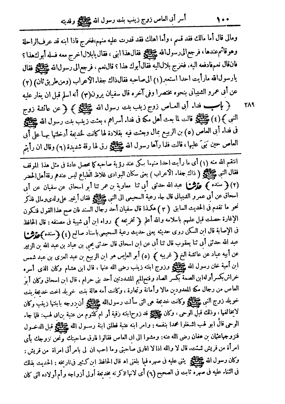 انتقم الله منه أي ما رأيت أحدا منهما بكى عند رؤية صاحبه كما يحصل عادة في مثل هذا الموقف فقال النبي صلى الله عليه وسلم (ذاك جفاء الأعراب) يعني سكان البوادي غلاظ الطباع ليس عندهم رقة أهل الحضر (سنده) حدثنا عبد الله أبي ثنا معاوية بن عمر ثنا أبو إسحاق عن سفيان عن أبي إسحاق عن أبي عمرو الشيباني قال جاء رعية السحيمي إلى النبي صلى الله عليه وسلم فقال أغير على ولدي ومالي فذكر نحو ما تقدم في الحديث السابق هكذا قال سفيان أحد رجال السند فإن صح هذا القول فتكون الإرادة حصلت قبل علمهم بإسلامه والله أعلم (تخريجه) رواه ابن أبي شيبة في مصنفه: قال الحافظ في الإصابة قال ابن السكن روى حديثه يعني حديث رعية السحيمي بإسناد صالح (سنده) حدثنا عبد الله حدثني أي ثنا يعقوب قال ثنا أبي عن ابن إسحاق قال حدثني يحيى بن عبادة بن عبد العزي بن عبد شمس ابن أمية ختن رسول الله صلى الله عليه وسلم وزوج ابنته زينب رضي الله عنها، قال ابن هشام وكان الذي أسره خراش بكسر أوله ابن الصمة بكسر الصاد وفته الميم المشددتين أحد بني حدرام، قال ابن إسحاق وكان أبوا العاص من رجال مكة المعدودين مالا وأمانة وتجارة، وكانت أمه هالة بنت خويلد أخت خديجة بنت خويلد زوج النبي صلى الله عليه وسلم وكانت خديجة هي التي سألت رسول الله صلى الله عليه وسلم أن يزوجه بابنتها زينب وكان لا يخالفها، وذلك قبل الوحي، وكان صلى الله عليه وسلم قد زوج ابنته رقية أو أم كلثوم من عتبة بن أبي لهب: فلما جاء الوحي قال أبو لهب اشغلوا محمدا بنفسه: وأمر ابنه عتبة فطلق ابنة رسول الله صلى الله عليه وسلم قبل الدخول فتزوجها عثمان بن عفان رضي الله عنه: ومشوا إلى أبي العاص فقالوا فارق صاحبتك ونحن نزوجك بأي امرأة، من قريش شئت، قال لا والله إذا لا أفارق صاحبتي وما أحب أن لي بامرأة من قريش: وكان رسول الله صلى الله عليه وسلم يثني عليه في صهره فيما بلغني اهـ قال الحافظ ابن كثير في تاريخه: الحديث بذلك في الثناء عليه في صهره ثابت في الصحيح أي لأنها ذكرته بخديجة أولى أزواجه وأم أولاده التي كان