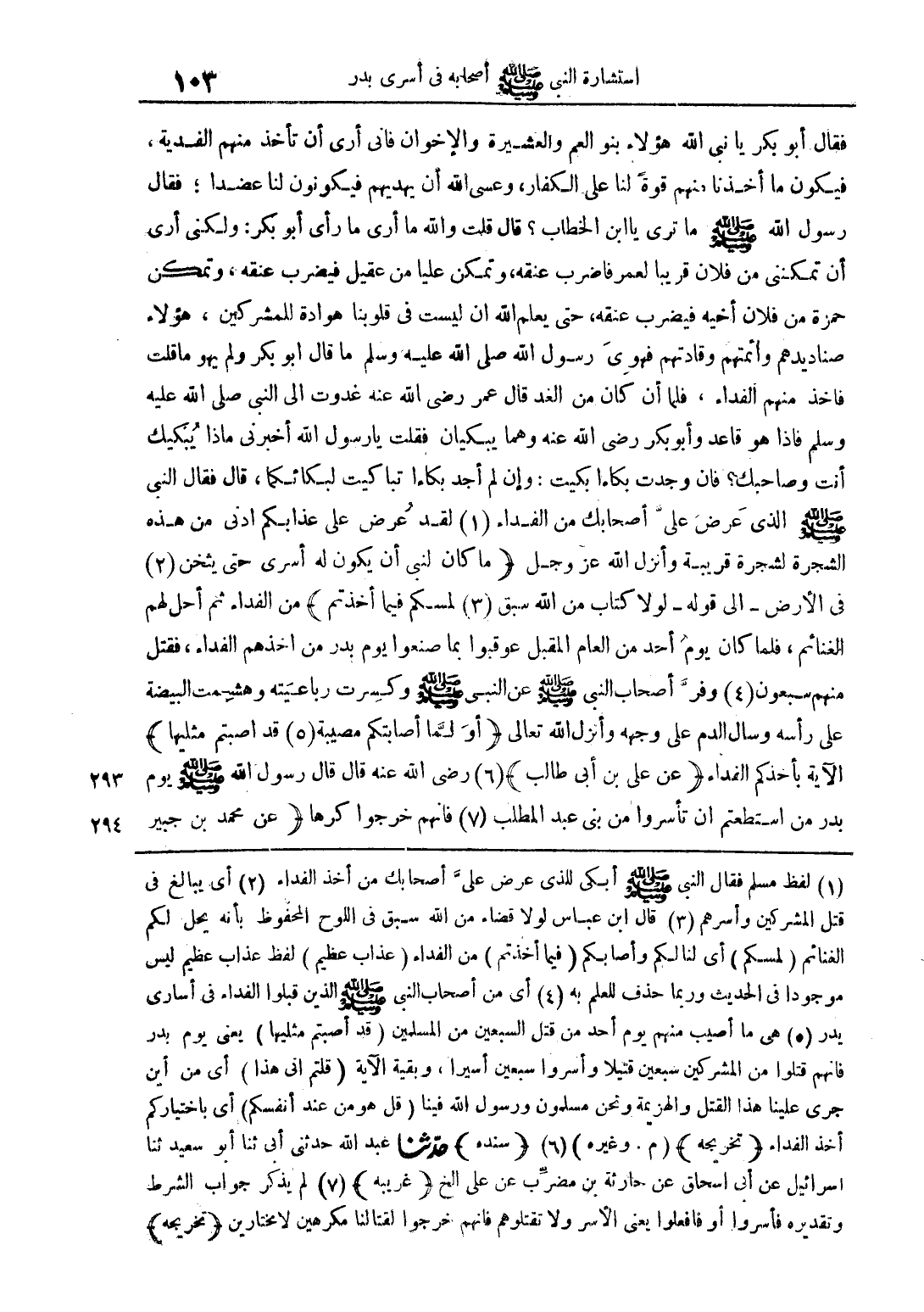 فقال أبو بكر يا نبي الله هؤلاء بنو العم والعشيرة والإخوان فإني أرى أن تأخذ منهم الفدية، فيكون ما أخذنا منهم قوة لنا على الكفار، وعسى الله أن يهديهم فيكونون لنا عضدا، فقال رسول الله صلى الله عليه وسلم ما ترى؟ يا بن الخطاب؟ قال قلت والله ما أرى ما رأى أبو بكر: ولكني أرى أن تملكني من فلان قريبا لعمر فاضرب عنقه، وتمكن عليا من عقيل فيضرب عنقه، وتمكن حمزة من فلان أخيه فيضرب عنقه، حتى يعلم الله أن ليست في قلوبنا هوادة للمشركين، هؤلاء صناديدهم وأئمتهم وقادتهم فهوى رسول الله صلى الله عليه وسلم ما قال أبو بكر ولم يهو ما قلت فخذ منهم الفداء، فلما آن كان من الغد قال عمر رضي الله عنه غدوت إلى النبي صلى الله عليه وسلم إذا هو قاعد وأبو بكر رضي الله عنه وهما يبكيان فقلت يا رسول الله أخبرني ماذا يبكيك أنت وصاحبك؟ فإن وجدت بكاء بكيت وإن لم أجد بكاء تباكيت لبكائكما قال: فقال النبي صلى الله عليه وسلم الذي عرض على أصحابك من الفداء لقد