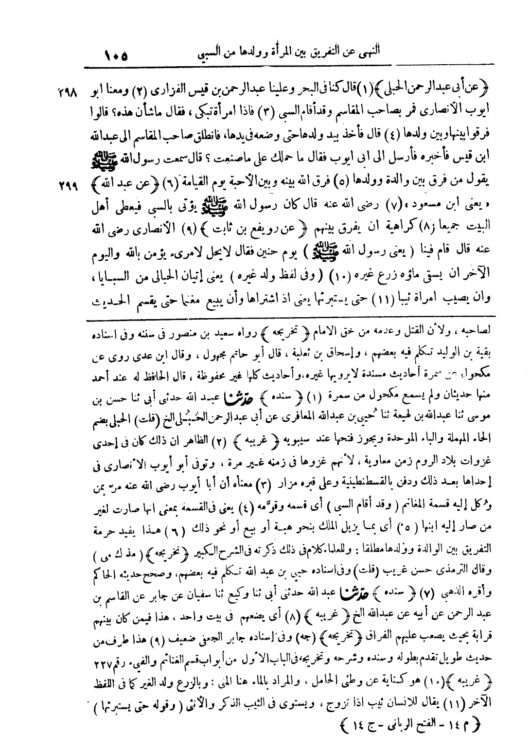 (عن أبي عبد الرحمن الحبلى) قال كنا في البحر وعلينا عبد الرحمن بن قيس الفرازي ومعنا أبو أيوب الأنصاري فمر بصاحب المقاسم وقد أقام السبى فإذا امرأة تبكي، فقال ما شان هذه؟ قالوا فرقوا بينها وبين ولدها قال فاخذ بيد ولدها حتى وضعه في يدها، فانطلق صاحب المقاسم إلى عبد الله ابن قيس فاخبره فأرسل إلى أبي أيوب فقال ما حملك على ما صنعت؟ قال سمعت رسول الله صلى الله عليه وسلم يقول من فرق بين والدة وولدها فرق الله بين وبين الأحبة يوم القيامة (عن عبد الله) (يعني ابن مسعود) رضي الله عنه قال رسول الله صلى الله عليه وسلم يؤتى بالسبي فيعطي أهل البيت جميعا كراهية أن يفرق بينهم (عن رويفع بن ثابت) الأنصاري رضي الله عنه قال قام فينا (يعني رسول الله صلى الله عليه وسلم) يوم حنين فقال لا يحل لامرئ يؤمن بالله واليوم الآخر أن يسقى ماؤه زرع غيره (وفي لفظ ولد غيره) يعني إتيان الحبالى من السبايا، وإن يصيب امرأة ثيبا حتى يستبرئها يعني إذا اشتراها وأن يبيع مغنما حتى يقسم الحديث