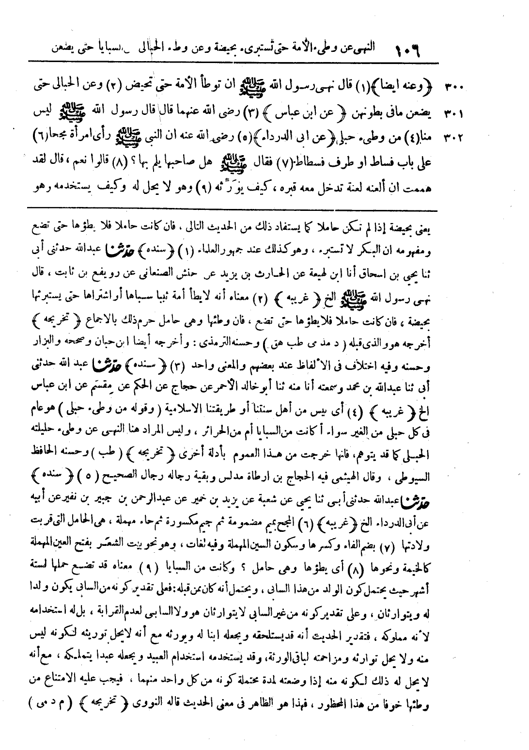 (وعنه أيضا) قال نهى رسول الله صلى الله عليه وسلم إن توطأ الأمة حتى تحيض وعن الحبالى حتى يضعن ما في بطونهن (عن ابن عباس) رضي الله عنهما قال: قال رسول الله صلى الله عليه وسلم ليس منا من وطئ حبلى (عن أبي الدرداء) رضي الله عنه أن النبي صلى الله عليه وسلم رأى امرأة مجحا على باب فساط أو طرف فسطاط فقال صلى الله عليه وسلم هل صاحبها يلم بها؟ قالوا نعم، قال لقد هممت أن ألعنه لعنة تدخل معه قبره، كيف يورثه وهو لا يحل له وكيف يستخدمه وهو