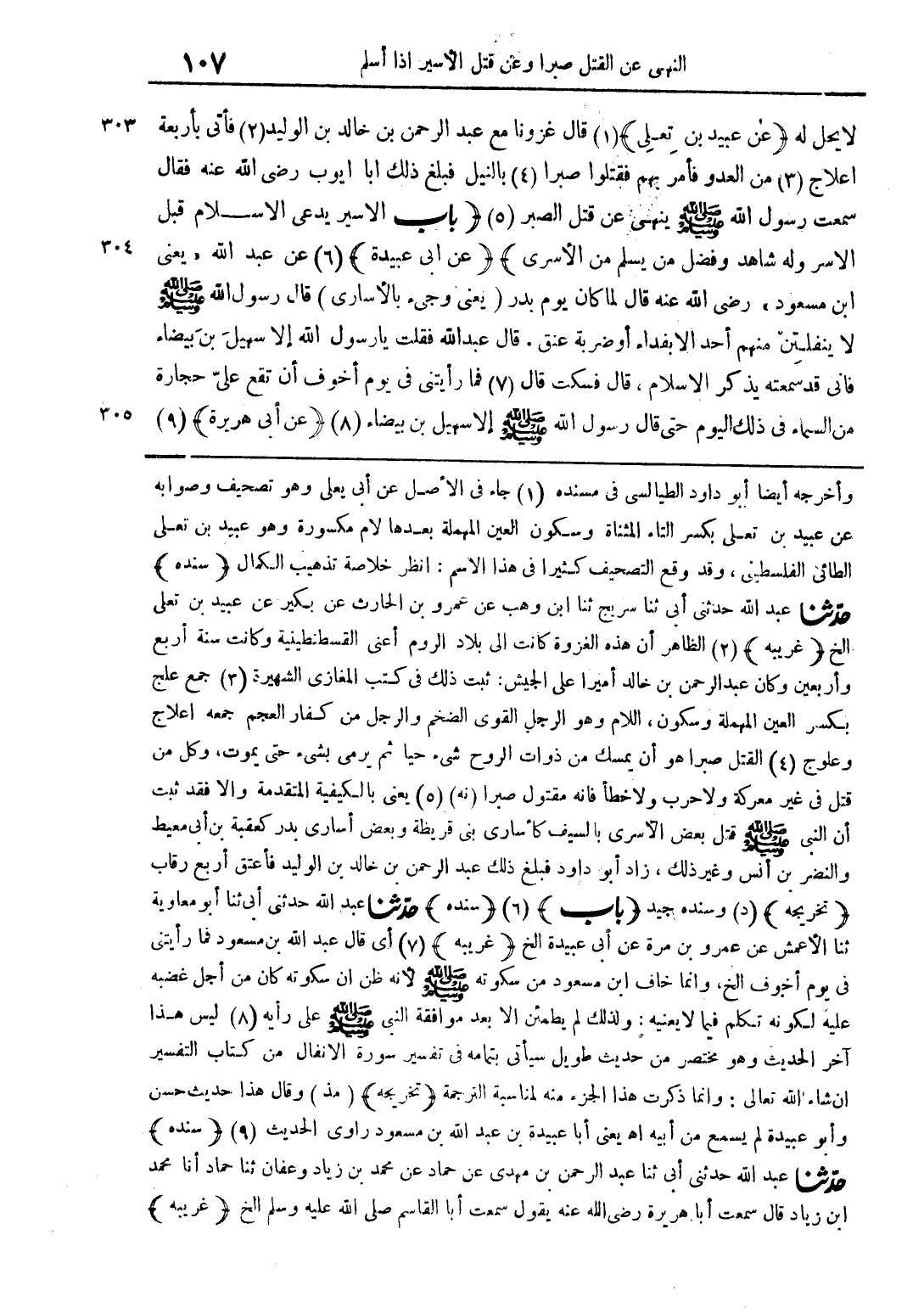 وأخرجه أيضا أبو داود الطيالسي في مسنده جاء في الأصل عن أبي يعلى وهو تصحيف وصوابه عن عبيد بن تعلى بكسر التاء المثناة وسكون العين المهملة بعدها لام مكسورة وهو عبيد بن تعلى الطائي الفلسطيني، وقد وقع التصحيف كثيرا في هذا الاسم: انظر خلاصة تذهيب الكمال (سنده) حدثنا عبد الله حدثني أبي ثنا ابن وهب عن عمرو بن الحارث عن بكير عن عبيد بن تعلى الخ (غريبة الظاهر أن هذه الغزوة كانت إلى بلاد الروم أعني القسطنطينية وكانت سنة أربع وأربعين وكان عبد الرحمن بن خالد أميرا على الجيش: ثبت ذلك في كتب المغازى الشهيرة جمع علج بكسر العين المهملة وسكون، اللام وهو الرجل القوي الضخم والرجل من كفار العجم جمعه اعلاج وعلوج القتل صبرا هو أن يمسك من ذوات الروح شيئ حيا ثم يرمى بشيء حتى يموت، وكل من أن النبي (ص قتل بعض الأسرى بالسيف كأسارى بني قريظة وبعض أسارى بدر كعقبة بن أبي معيط والنضر بن أنس وغير ذلك، زاد أبو داود فبلغ ذلك عبد الرحمن بن خالد بن الوليد فأعتق أربع رقاب (تخريجه) وسنده جيد (باب) (سنده) حدثنا عبد الله حدثني أبي ثنا أبو معاوية ثنا الأعمش عن عمرو بن مرة عن أبي عبيدة الخ (غريبة) أي قال عبد الله بن مسعود فما رأيتني في يوم أخوف الخ، وإنما خاف ابن مسعود من سكوته صلى الله عليه وسلم لأنه ظن أن سكوته كان من أجل غضبه عليه لكونه تكلم فيما لا يعنيه: ولذلك لم يطمئن إلا بعد موافقة النبي صلى الله عليه وسلم على رأيه ليس هذا آخر الحديث وهو مختصر من حديث طويل سيأتي بتمامه في تفسير سورة الأنفال من كتاب التفسير إن شاء الله تعالى: وإنما ذكرت هذا الجزء منه لمناسبة الترجمة (تخريجه) (مذ) وقال هذا حديث حسن وأبو عبيدة لم يسمع من أبيه اهـ يعني أبا عبيدة بن عبد الله بن مسعود راوي الحديث (سنده) حدثنا عبد الله حدثني أبي ثنا عبد الرحمن بن مهدي عن حماد عن محمد بن زياد وعفان ثنا حماد أنا محمد ابن زياد قال سمعت أبا هريرة رضي الله عنه يقول سمعت أبا القاسم صلى الله عليه وسلم الخ (غريبه)
