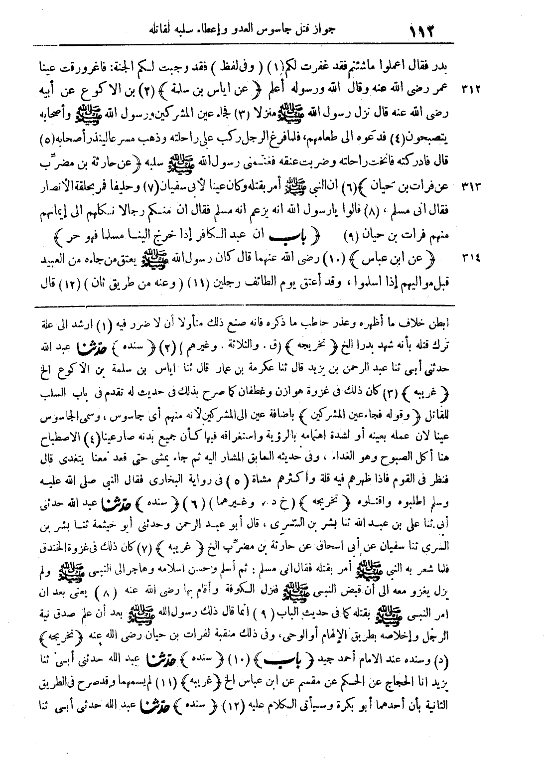 أبطن خلاف ما أظهره وعذر حاطب ما ذكره فإنه صنع ذلك متأولا أن لا ضرر أرشد إلى علة ترك قتله بأنه شهد بدرا الخ (تخريجه) (ق. والثلاثة. وغيرهم) (سنده) حدثنا عبد الله حدثني أبي ثنا عبد الرحمن بن يزيد قال ثنا عكرمة بن عمار قال ثنا إياس بن سلمة بن الأكوع الخ (غريبة) كان ذلك في غزوة هوازن وغطفان كما صرح بذلك في حديث له تقدم في باب السلب للقاتل (وقوله فجاء عين المشركين) بإضافة عين إلى المشركين لأنه منهم أي جاسوس، وسمى الجاسوس عينا لأن عمله بعينه أو لشدة اهتمامه بالرؤية واستغراقه فيها كأن جميع بدنه صار عينا الاصطباح هنا أكل الصبوح وهو الغذاء، وفي حديثه السابق المشار إليه ثم جاء يمشي حتى قعد معنا يتغذى قال فنظر في القوم فإذا ظهرهم فيه قلة وأكثرهم مشاة في رواية البخاري فقال النبي صلى الله عليه وسلم اطلبوه واقتلوه (تخريجه) (خ د وغيرهما) (سنده) حدثنا عبد الله حدثني أبي ثنا علي بن عبد الله ثنا بشر بن السري، قال أبو عبد الرحمن وحدثني أبو خيثمة ثنا بشر بن السري ثنا سفيان عن أبي إسحاق عن حارثة بن مضرب الخ (غريبة) كان ذلك في غزوة الخندق فلما شعر به النبي صلى الله عليه وسلم أمر بقتله فقال إني مسلم: ثم أسلم وحسن إسلامه وهاجر إلى النبي صلى الله عليه وسلم ولم يزل يغزو معه إلى أن قبض النبي صلى الله عليه وسلم فنزل الكوفة وأقام بها رضي الله عنه يعني بعد أن أمر النبي صلى الله عليه وسلم بقتله كما في حديث الباب إنما قال ذلك رسول الله صلى الله عليه وسلم بعد أن علم صدق نية الرجل وإخلاصه بطريق الإلهام أو الوحي، وفي ذلك منقبة لفرات بن حيان رضي الله عنه (تخريجه) (د) وسنده عند الإمام أحمد جيد (باب) (سنده) حدثنا عبد الله حدثني أبي ثنا يزيد أنا الحجاج عن الحكم عن مقسم عن ابن عباس الخ (غريبة) لم يسمعها وقد صرح في الطريق الثانية بأن أحدهما أبو بكرة وسيأتي الكلام عليه (سنده) حدثنا عبد الله حدثني أبي ثنا