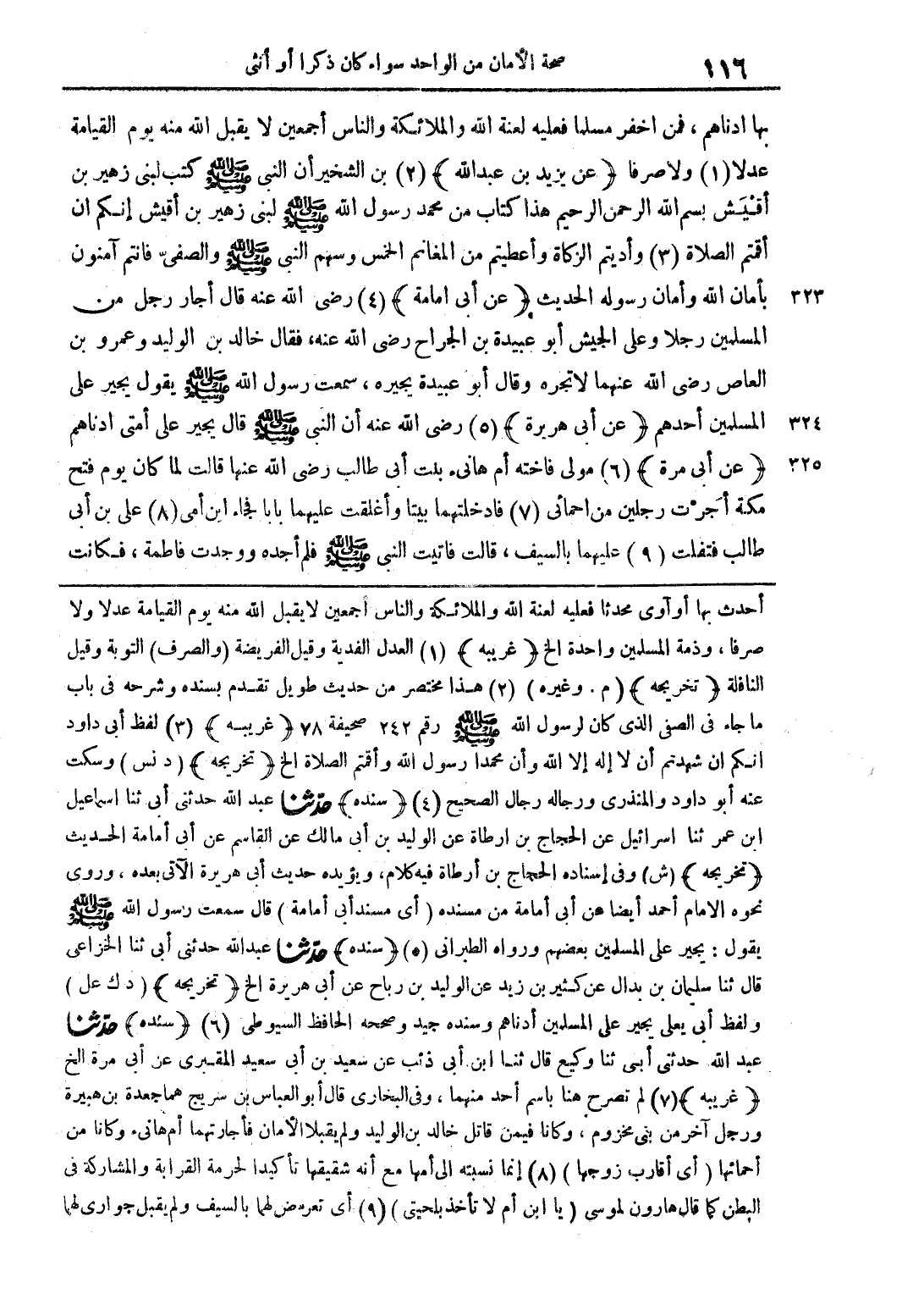 بها أدناهم، فمن أخفر مسلما فعليه لعنة الله والملائكة والناس أجمعين لا يقبل الله منه يوم القيامة عدلا ولا صرفا (لا يزيد بن عبد الله) بن الشخير أن النبي صلى الله عليه وسلم كتب لبني زهير بن أقيس بسم الله الرحمن الرحيم هذا كتاب من محمد رسول الله صلى الله عليه وسلم لبني زهير بن أقيش إنكم آمنون بأمان الله وأمان رسوله الحديث (عن أبي أمامه) رضي الله عنه قال أجار رجل من المسلمين رجلا وعلى الجيش أبو عبيدة بن الجراح رضي الله عنه، فقال خالد بن الوليد وعمرو بن العاص رضي الله عنهما لا تجره وقال أبو عبيدة يجيره، سمعت رسول الله صلى الله عليه وسلم يقول يجير على المسلمين أحدهم (عن أبي هريرة) رضي الله عنه أن النبي صلى الله عليه وسلم قال يجير على أمتي أدناهم (عن أبي مرة) مولى فأخته أم هاني بنت أبي طالب رضي الله عنها قالت لما كان يوم فتح مكة أجرت رجلين من إحمائي فأدخلتهما بيتا وأغلقت عليهما بابا فجاء أين أمي علي بن أبي طالب فتفلت عليهما بالسيف، قالت فأتيت النبي صلى الله عليه وسلم فلم أجده ووجدت فاطمة، فكانت