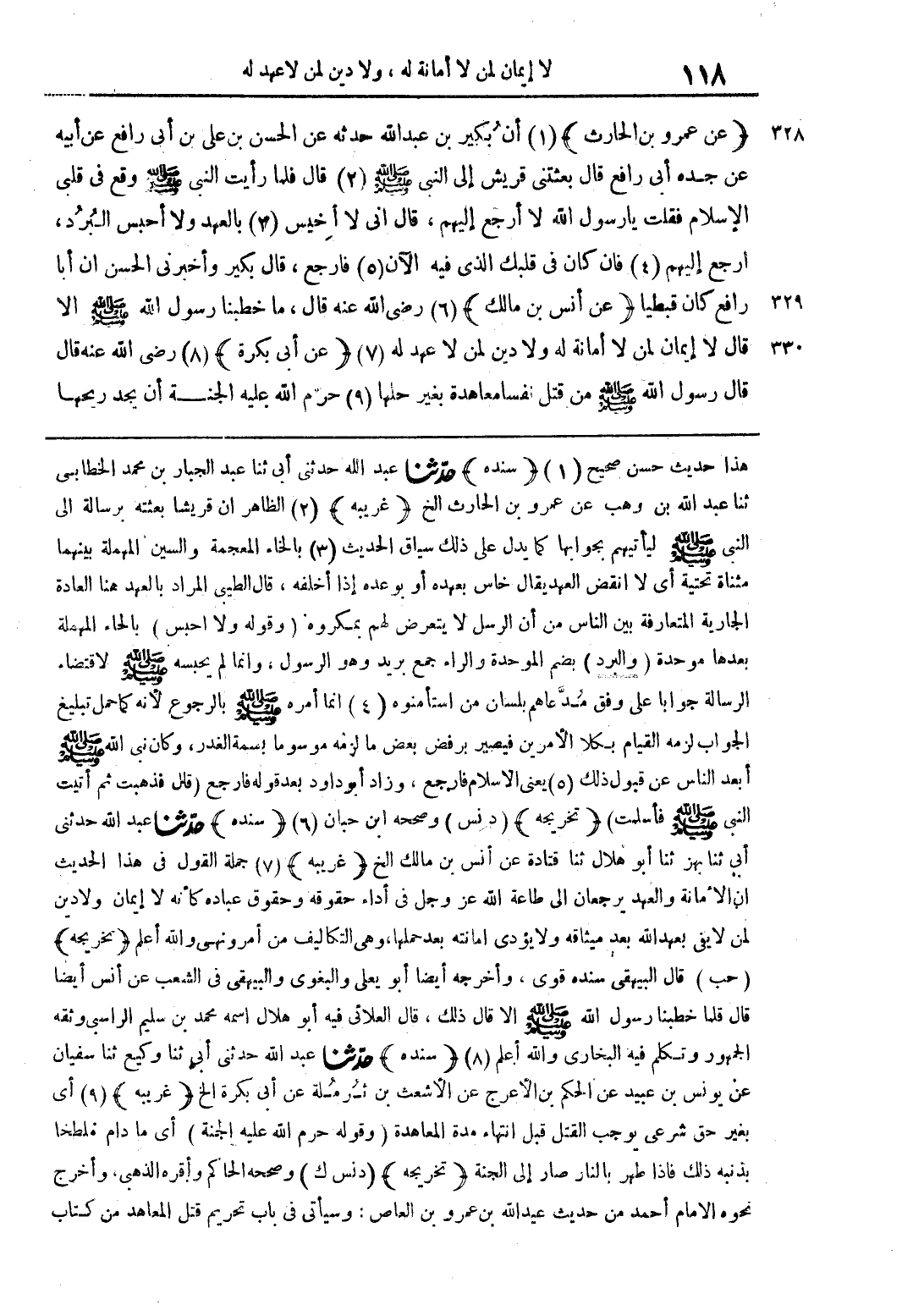 هذا حديث حسن صحيح (سنده) حدثنا عبد الله حدثني أبي ثنا عبد الجبار بن محمد الخطابي ثنا عبد الله بن وهب عن عمرو بن الحارث الخ (غريبة) الظاهر أن قريشا بعثته برسالة إلى النبي صلى الله عليه وسلم ليأتيهم بجوابها كما يدل على ذلك سياق الحديث بالخاء المعجمة والسين المهملة بينهما مثناة تحتية لا انقض العهد يقال خاس بعهده أو بوعده إذا أخلفه، قال الطيبي المراد بالعهد هنا العادة الجارية المتعارفة بين الناس من أن الرسل لا يتعرض لهم بمكروه (وقوله ولا احبس) بالحاء المهملة بعدها موحدة (والبرد) بضم الموحدة والراء جمع بريد وهو الرسول، وإنما لم يحبسه صلى الله عليه وسلم لاقتضاء الرسالة جوابا على وفق مدعاهم بلسان من استأمنوه إنما أمره صلى الله عليه وسلم بالرجوع لأنه كما حمل تبليغ الجواب لزمه القيام بكلا الأمرين فيصير برفض بعض ما لزمه موسوما بسمة الغدر، وكان نبي الله صلى الله عليه وسلم أبعد الناس عن قبول ذلك يعني الإسلام فارجع، وزاد أبو داود بعد قوله فارجع (قال فذهبت ثم أتيت النبي صلى الله عليه وسلم فأسلمت) (تخريجه) (د نس) وصححه ابن حبان (سنده) حدثنا عبد الله حدثني أبي ثنا بهز ثنا أبو هلال ثنا قتادة عن أنس بن مالك الخ (غريبة) جملة القول في هذا الحديث إن الأمانة والعهد يرجعان إلى طاعة الله عز وجل في أداء حقوقه وحقوق عباده كأنه لا إيمان ولا دين لمن لا يفي بعهد ميثاقه ولا يؤدي أمانته بعد حملها، وهي التكاليف من أمر ونهي والله أعلم (تخريجه) (حب) قال البيهقي سنده قوي، وأخرجه أيضا أبو يعلى والبغوي والبيهقي في الشعب عن أنس أيضا قال قلما خطبنا رسول الله صلى الله عليه وسلم إلا قال ذلك، قال العلائى فيه أبو هلال اسمه محمد بن سليم الراسي وثقه الجمهور وتكلم فيه البخاري والله أعلم (سنده) حدثنا عبد الله حدثني أي ثنا وكيع ثنا سفيان عن يونس بن عبيد عن الحكم بن الأعرج عن الأشعث بن ثرملة عن أبي بكرة الخ (غريبة) أي بغير حق شرعي يوجب القتل قبل انتهاء مدة المعاهدة (وقوله حرم الله عليه الجنة) أي ما دام ملطخا بذنبه ذلك فإذا طهر بالنار صار إلى الجنة (تخريجه) (د نس ك) وصححه الحاكم وأقره الذهبي، وأخرج نحوه الإمام أحمد من حديث عبد الله بن عمرو بن العاص: وسيأتي في باب تحريم قتل المعاهد من كتاب