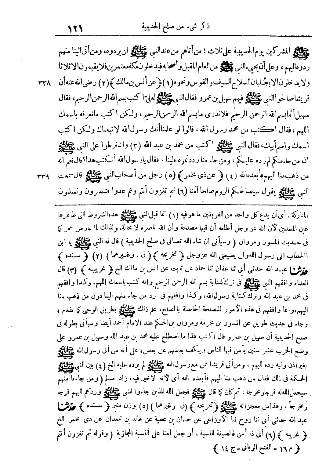 المتاركة أي أن يدع كل واحد من الفريقين ما هو فيه إنما قبل النبي صلى الله عليه وسلم هذه الشروط التي ظاهرها غبن المسلمين لأن الله عز وجل أطلعه أن فيها مصلحة وإن الله ناصره لا محالة، ولذلك لما عارض عمر كما في حديث المسور ومروان (وسيأتي إن شاء الله تعالى في صلح الحديبية) قال له النبي صلى الله عليه وسلم يا ابن الخطاب إني رسول الله ولن يضيعني الله عز وجل (تخريجه) (ق. وغيرهما) (سنده) حدثنا عبد الله حدثني أبي ثنا عفان ثنا حماد عن ثابت عن أنس بن مالك الخ (غريبة) قال العلماء وافقهم النبي صلى الله عليه وسلم في ترك كتابة بسم الله الرحمن الرحيم وأنه كتب باسمك اللهم، وكذا وافقهم في محمد بن عبد الله وترك كتابة رسول الله، وكذا وافقهم في رد من جاء منهم ألينا دون من ذهب منا إليهم، وإنما وافقهم في هذه الأمور المصلحة الحاصلة بالصلح، علم ذلك صلى الله عليه وسلم بطريق الوحي كما تقدم، وجاء في حديث طويل عن المسور بن مخرمة ومروان بن الحكم عن الإمام أحمد أيضا وسيأتي بطوله في صلح الحديبية أن سهيل بن عمرة قال أكتب هذا ما أصطلح عليه محمد بن عبد الله وسهيل بن عمرو وعلي وضع الحرب عشر سنين يأمن فيها الناس ويكف بعضهم عن بعض، على أنه من أتى رسول الله صلى الله عليه وسلم بغير إذن وليه رده إليهم، ومن أتى قريشا ممن مع رسول الله صلى الله عليه وسلم لم يرده عليه الخ بين النبي صلى الله عليه وسلم الحكمة في ذلك فقال من ذهب منا إليهم فأبعده الله أي لأنه لا خير فيه، زاد مسلم (ومن جاءنا منهم سيجعل الله له فرجا ومخرجا: ثم كان كما قال صلى الله عليه وسلم فجعل الله الذين جاءوا للنبي صلى الله عليه وسلم وردهم إليهم فرجا ومخرجا، وهذا من معجزاته صلى الله عليه وسلم (تخريجه) (ق. وغيرهما) بوزن منبر (سنده) حدثنا عبد الله حدثني أبي ثنا روح ثنا الأوزاعي عن حسان بن عطية عن خالد بن معدان عن ذي مخمر الخ (غريبة) أي ذا أمكن فالصيغة للنسبة، أو جعل آمنا على النسبة المجازية (وقوله ثم تغزون أنتم