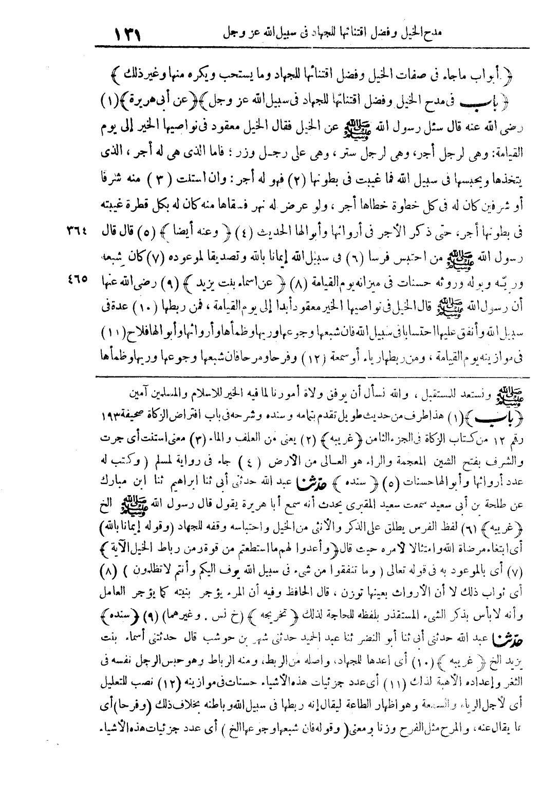 صلى الله عليه وسلم ونستعد للمستقبل، والله نسأل أن يوفق ولاة أمورنا لما فيه الخير للإسلام والمسلمين آمين (باب) هذا طرف من حديث طويل تقدم بتمامه وسنده وشرحه في باب افتراض الزكاة صحيفة 193 رقم 12 من كتاب الزكاة في الجزء الثامن (غريبة) يعني من العلف والماء معنى استنت أي جرت والشرف بفتح الشين المعجمة والراء هو العالي من الأرض جاء في رواية لمسلم (وكتب له عدد أروائها وأبوا لها حسنات) (سنده) حدثنا عبد الله أبي ثنا إبراهيم ثنا ابن مبارك عن طلحة عن أبي سعيد سمعت سعيد المقبري يحدق أنه سمع أبا هريرة يقول قال رسول الله صلى الله عليه وسلم الخ (غريبة) لفظ الرفس يطلق على الذكر والأنثى من الخيل واحتباسه وقفة للجهاد (وقوله إيمانا بالله) أي ابتغاء مرضاة الله وامتثالا لأمره حيث قال (واعدوا لهم ما استطعتم من قوة ومن رباط الخيل الآية) أي بالموعود به في قوله تعالى (وما تنفقوا بشيء في سبيل الله يوف إليكم وأنتم لا تظلمون) أي ثواب ذلك لا أن الأرواث بعينها توزن، قال الحافظ وفيه أن المرء يؤجر بنيته كما يؤجر العامل وأنه لا بأس بذكر الشيء المستقذر بلفظه للحاجة لذلك (تخريجه) (خ نس. وغيرهما) (سنده) حدثنا عبد الله حدثني أبي ثنا النضر ثنا عبد الحميد حدثني شهر بم حوشب قال حدثني أسماء بنت يزيد الخ (غريب) أي أعدها للجهاد، وأصله من الربط، ومنه الرباط وهو حبس الرجل نفسه في الثغر وإعداده الأهبة لذلك أي عدد جزئيات هذه الأشياء حسنات في موازينه نصب للتعليل أي لأجل الرياء والسمعة وهو إظهار الطاعة ليقال إنه ربطها في سبيل الله وباطنه بخلاف ذلك (وفرحا) أي مما يقال عنه، والمرح مثل الفرح وزنا ومعنى (وقوله فإن شبعها وجوعها الخ) أي عدد جزئيات هذه الأشياء