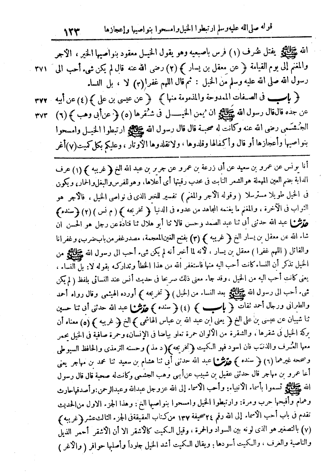 أنا يونس عن عمرو بن سعيد عن أبي زرعة بن عمرو عن جرير بن عبه الله الخ (غريبة) عرف الدابة بضم العين المهملة هو الشعر النابت في محدب رقبتها أي أعلاها، وهو الفرس والبغل والحمار، ويكون الثواب في الآخرة، والمغنم ما يغنمه المجاهد عن عدوه في الدنيا (تخريجه) (م نس) (سنده) حدثنا عبد الله حدثني أبي ثنا عبد الصمد قالا ثنا أبو هلال ثنا قتادة عن رجل هو الحسن أن شاء الله عن معقل بن يسار الخ (غريبة) بفتح العين المعجمة، مصدر غفر من باب ضرب، وغفر أنا والقائل (اللهم غفرا) معقل بن يسار، لأنه لما أخبر أنه لم يكن شيء أحب إلى رسول الله صلى الله عليه وسلم من الخيل تذكر أن النساء كانت أحب إليه منها فاستغفر الله من هذا الخطأ وتداركه بقوله لا: بل النساء، يعني كانت أحب إليه من الخيل، وقد جاء معنى ذلك صريحا في حديث أنس عند النسائي بلفظ (لم يكن شيء أحب إلى رسول الله صلى الله عليه وسلم بعد النساء من الخيل) (تخريجه) أورده الهيثمي وقال رواه أحمد والطبراني ورجال أحمد ثقات (باب) (سنده) حدثنا عبد الله حدثني أبي ثنا حسين ثنا شيبان عن عيسى بن علي الخ (يعني ابن عبد لله بن عباس الهاشمي) الخ (غريبة معناه أن بركة الخيل في شقرها، والشقرة من الألوان حمرة تعلوا بياضا في الإنسان، وحمرة صافية ي الخيل يحمر معها العرف والذنب فإن أسود فهو الكميت (تخريجه) (د مذ) وحسنه الترمذي والحافظ السيوطي وصححه وغيرهما (سنده) حدثنا عبد الله حدثني أبي ثنا هشام بن سعيد ثنا محمد بن مهاجر يعني أخا عمرو بن مهاجر قال حدثني عقيل بن شبيب عن أبي وهب الجشمي وكانت له صحبة قال: قال رسول الله صلى الله عليه وسلم تسمو بأسماء الأنبياء: وأحب الأسماء إلى الله عز وجل عبد الله وعبد الرحمن: وأصدقها حارث وهمام وأقبحها حرب ومرة: وارتبطوا الخيل وامسحوا بنواصيها الخ: وهذا الجزء الأول من الحديث تقدم في باب أحب الأسماء إلى الله رقم 24 صحيفة 137 من كتاب العقيقة في الجزء الثالث عشر (غريبة) بالتصغير هو الذي لونه بين السواد والحمرة، وقيل الكميت كالأشقر أحمر الذيل والناصية والعرف، والكميت أسودها: ويقال الكميت أشد الخيل جلودا وأصلها حوافر (والأغر)