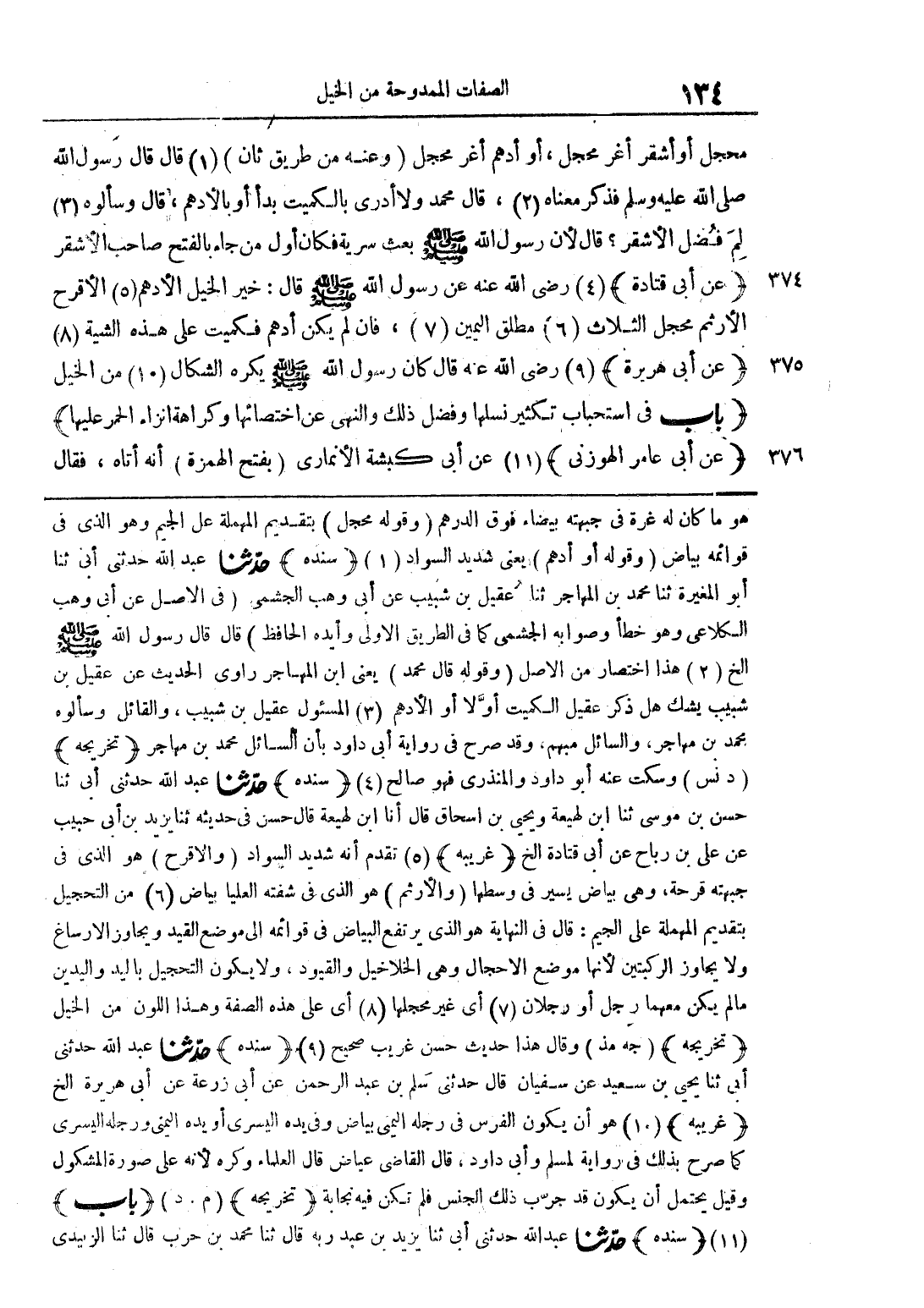 محجل أو أشقر أغر محجل، أو أدهم أغر محجل (وعنه من طريق ثان) قال: قال رسول الله صلى الله عليه وسلم فذكر معناه، قال محمد ولا أدري بالكميت بدأ أو بالأدهم، قال وسألوه لم فضل الأشقر؟ قال لأن رسول الله صلى الله عليه وسلم بعث سرية فكان أول من جاء بالفتح صاحب الأشقر (عن أبي قتادة) رضي الله عنه عن رسول الله صلى الله عليه وسلم قال: خير الخيل الأدهم الأقرح الأرثم محجل الثلاث مطلق اليمين، فإن لم يكن أدهم فكميت على هذه الشية (عن أبي هريرة) رضي الله عنه قال كان رسول الله صلى الله عليه وسلم يكره الشكال من الخيل