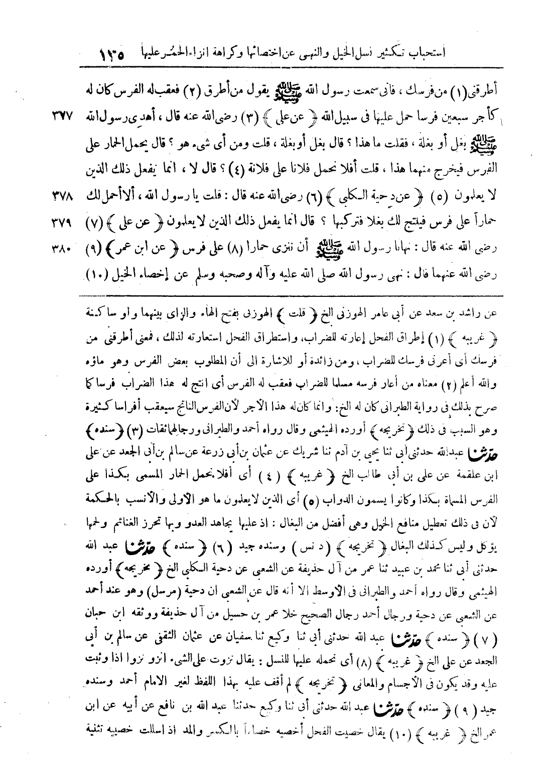 عن راشد بن سعد عن أبي عامر الهموزني الخ (قلت) الهوزني بفتح الهاء والزاي بينهما وأو ساكنة (غريبة) إطراق الفحل إعارته للضرائب، واستعارته لذلك، فمعنى أطرقني من فرسك أي أعرني فرسك للضرائب، ومن زائدة أو للإشارة إلى أن المطلوب بعض الرفس وهو ماءه والله أعلم معناه من أعار فرسه مسلما للضرائب فعقب له الفرس أي نتج له هذا الضراب فرسا كما صرح في ذلك في رواية الطبراني كان له الخ: وإنما كان له هذا الأجر لأن الفرس الناتج سيعقب أفراسا كثيرة وهو السبب في ذلك (تخريجه) أورده الهيثمي وقال رواه أحمد والطبراني ورجالهما ثقات (سنده) حدثنا عبد الله حدثني أبي ثنا يحيى بن آدم ثنا شريك عن عثمان بن أبي زرعة عن سالم بن أبي الجعد عن علي ابن علقمة عن علي بن أبي طالب الخ (غريبة) أي أفلا نحمل الحمار المسمى بكذا على الفرس المسماة بكذا وكان يسمون الدواب أي الذين لا يعلمون ما هو الأولى والأنسب بالحكمة لأن في ذلك تعطيل منافع الخيل وهي أفضل من البغال: إذ عليها يجاهد العدو وبها تحرر الغنائم ولحمها يؤكل وليس كذلك البغال (تخريجه) (د نس) وسنده جيد (سنده) حدثنا عبد الله حدثني أبي ثنا محمد بن عبيد ثنا عمر من آل حذيفة عن الشعبي عن دحية الكلبي الخ (تخريجه) أورده الهيثمي وقال رواه أحمد والطبراني في الأوسط إلا أنه قال عن الشعبي أنم دحية (مرسل) وهو عند أحمد عن الشعبي عن دحية ورجال أحمد رجال أحمد رجال الصحيح خلا عمر بن حسيل من آل حذيفة ووثقة ابن حبان (سنده) حدثنا عبد الله حدثني أبي ثنا وكيع ثنا سفيان عن عثمان الثقفي عن سالم بن أبي الجعد عن علي الخ (غريبة) أي نحمله عليها للنسل: يقال نزوت على الشيء النزو نزوا إذا وثبت عليه وقد يكون في الأجسام والمعاني (تخريجه) لم أقف عليه بهذا اللفظ لغير الإمام أحمد وسنده جيد (سنده) حدثنا عبد الله حدثني أبي ثنا وكيع حدثنا عبد الله بن نافع عن أبيه عن ابن عمر الخ (غريبة) يقال خصيت الفحل أخصيه خصاءا بالكسر والمد إذا سللت خصيبة تثنية