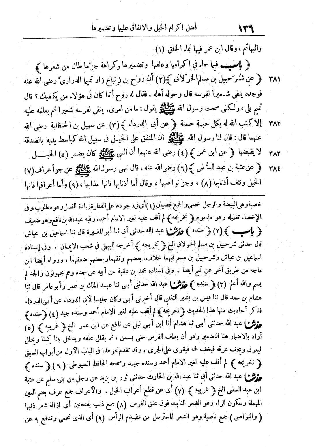 (عن شر حبيل بن مسلم الخولاني) أن روح بن زنباع زار تميما الدراري رضي الله عنه فوجده ينقى شعيرا لفرسه قال وحوله أهله، فقال له روح أما كان في هؤلاء من يكفيك؟ قال تميم بلى، ولكني سمعت رسول الله صلى الله عليه وسلم يقول: ما من امرئ ينقى لفرسه شعيرا ثم يعلفه عليه إلا كتب الله له بكل حبة حسنة (عن أبي الدرداء) عن سهيل بن الحنظلية رضي الله عنهما قال: قال لنا رسول الله صلى الله عليه وسلم إن المنفق على الخيل في سبيل الله كباسط يديه بالصدقة لا يقبضها (عن ابن عمر) رضي الله عنهما أن النبي صلى الله عليه وسلم كان يضمر الخيل (عن عتبة بن عبد السلمى) رضي الله عنه، قال نهى رسول الله صلى الله عليه وسلم عن جزأ عراف الخيل ونتف أذ 1 نابها، وجز نواصيها، وقال أما أذنابها فإنها مذابها، وأما أعرافها فإنها