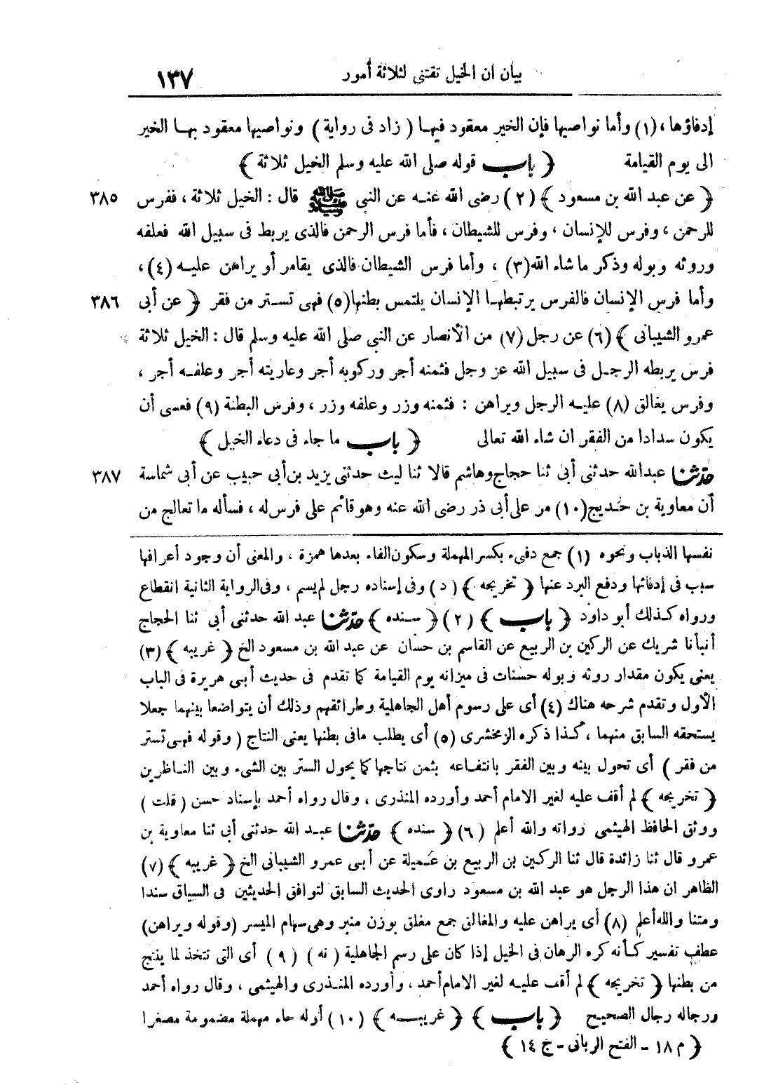 (عن عبد الله بن مسعود) رضي الله عنه عن النبي صلى الله عليه وسلم قال: الخيل ثلاثة، ففرس للرحمن، وفرس للإنسان، وفرس للشيطان، فأما فرس الرحمن فالذي يربط في سبيل الله فعلفه وروثه وبوله وذكر ما شاء الله، وأما فرس الشيطان فالذي يقامر أو يراهن عليه، وأما فرس الإنسان فالفرس يرتبطها الإنسان يلتمس بطنها فهي تستر من فقر (عن أبي عمرو الشيباني) عن رجل من الأنصار عن النبي صلى الله عليه وسلم، قال: الخيل ثلاثة فرس يربطه الرجل في سبيل الله عز وجل فثمنه أجر وركوبه أجر وعاريته أجر وعلفه أجر، وفرس يغالق عليه الرجل ويراهن: فثمنه وزر وعلفه وزر، وفرس البطنة فعسى أن يكون سدادا من الفقر إن شاء الله تعالى (باب ما جاء في دعاء الخيل)