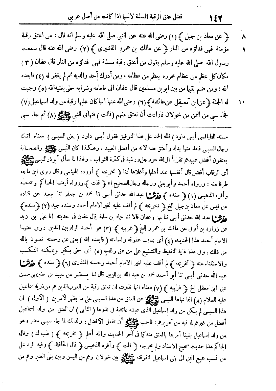 (عن معاذ بن جبل) رضي الله عنه عن النبي صلى الله عليه وسلم أنه قال: مكن أعتق رقبة مؤمنة فهي فداؤه من النار (عن مالك بن عمرو القشري) رضي الله عنه قال سمعت رسول الله صلى الله عليه وسلم يقول من أعتق رقبة مسلمة فهي فدائه من النار قاتل عفان مكان كل عظم من عظام محرره بعظم من عظامه، ومن أدرك أحد والديه ثم لم يغفر له فأبعده الله: ومن ضم يتيما من بين أبوين مسلمين قال عفان إلى طعامه وشرابه حتى يغنيه الله وجبت له الجنة (عن ابن معقل عن عائشة) رضي الله عنها أنها كان عليها رقبة من ولد إسماعيل فجاء سبي من اليمن من خولان فأرادت أن تعتق منهم (قالت) فنهاني الني صلى الله عليه وسلم ثم جاء سبي