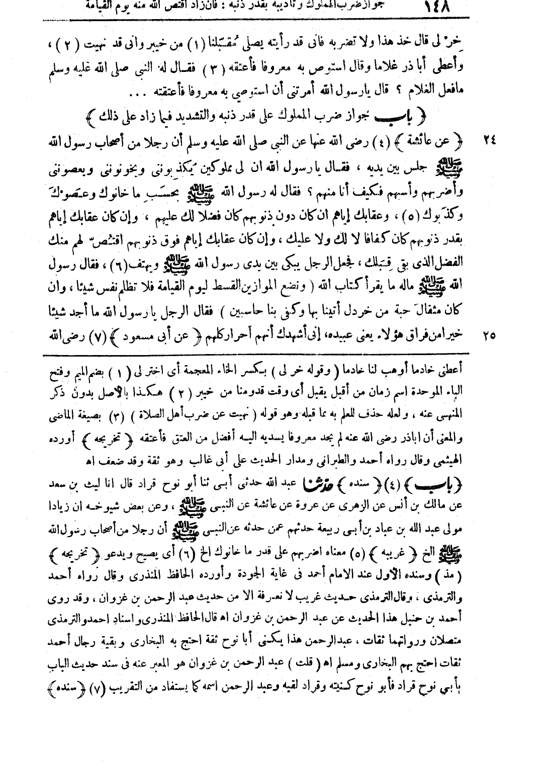(باب) (سنده) حدثنا عبد الله حدثني أبي ثنا أبو نوح قراد قال أنا ليث بن سعد عن مالك بن أنس عن الزهري عن عروة عن عائشة عن النبي صلى الله عليه وسلم، وعن بعض شيوخه إن زيادا مولى عبد الله بن عباد بن أبي ربيعة حدثهم عمن حدثه عن النبي صلى الله عليه وسلم أن رجلا من أصحاب رسول الله صلى الله عليه وسلم الخ (غريبة) معناه أضربهم على قدر ما خانوك الخ أي يصيح ويدعوا (تخريجه) (مذ) وسنده الأول عند الإمام أحمد في غاية الجودة وأورده الحافظ المنذري وقال رواه أحمد والترمذي، وقال الترمذي حديث غريب لا نعرفه إلا من حديث عبد الرحمن بن غزوان، وقد روى أحمد بن حنبل هذا الحديث عن عبد الرحمن بن غزوان اهـ قال الحافظ المنذري وإسناد أحمد والترمذي متصلان ورواتهما ثقات، عبد الرحمن بن غزوان هو المعبر عنه في سند حديث الباب بأبي نوح قراد فأبو نوح كنيته وقراد لقيه وعبد الرحمن بن غزوان هو المعبر عنه في سند حديث الباب بأبي نوح قراد فأبو نوح كنيته وقراد لقيه وعبد الرحمن اسمه كما يستفاد من التقريب (سنده)