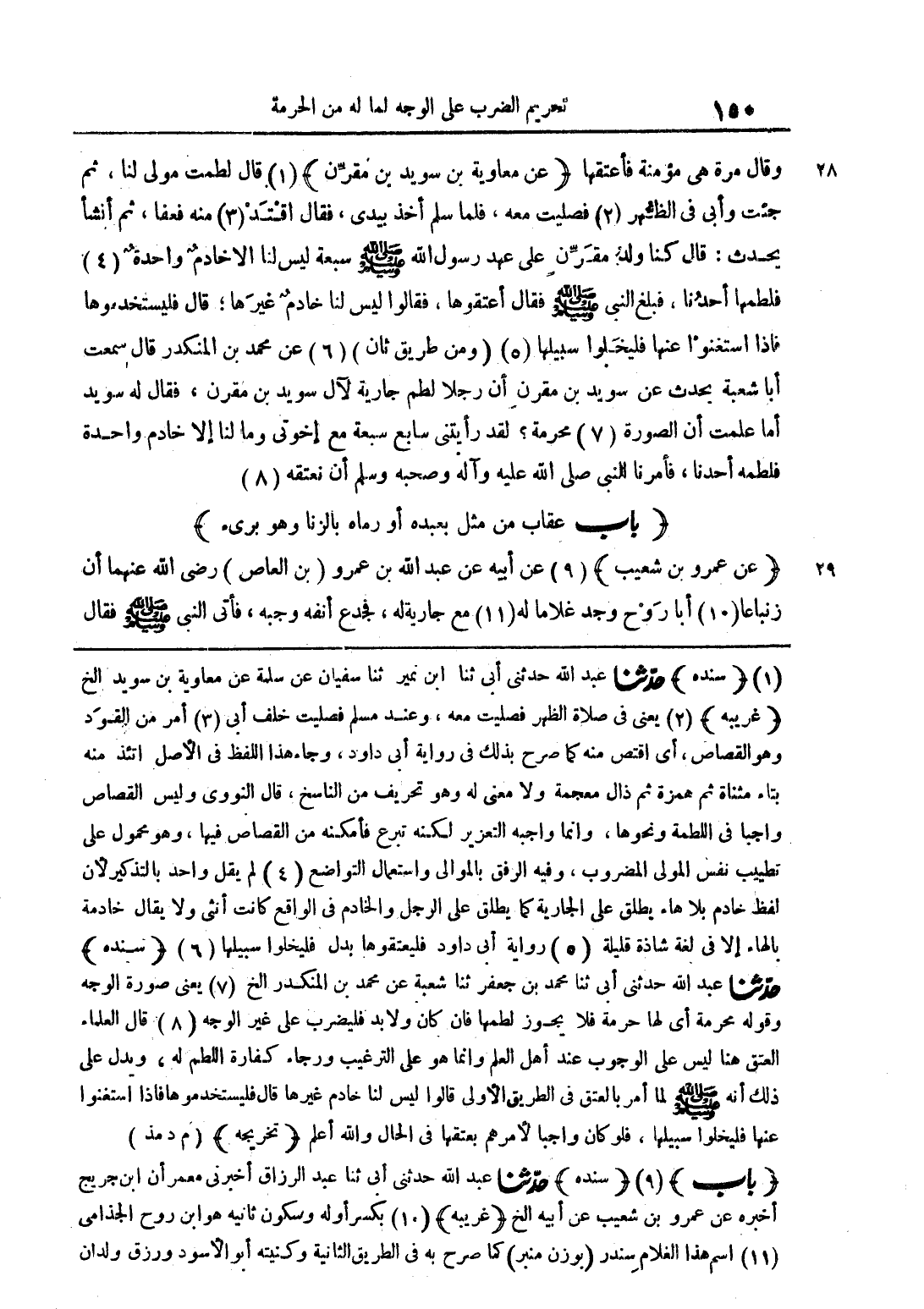 (سنده) حدثنا عبد الله حدثني أبي ثنا ابن نمير ثنا سفيان عن سلمة عن معاوية بن سويد الخ (غريبة) يعني في صلاة الظهر فصليت معه، وعند مسلم فصليت خلف أبي أمر من القود وهو القصاص، أي اقتص منه كما صرح بذلك في رواية أبي داود، وجاء هذا اللفظ في الأصل اتئذ منه بتاء مثناة ثم همزة ثم ذال معجمة ولا معنى له وهو تحريف من الناسخ، قال النووي وليس القصاص واجبا في اللطمة ونحوها، وإنما واجبه التعزير لكنه تبرع فأمكنه من القصاص فيها، وهو محمول على تطييب نفس المولى المضروب، وفيه الرفق بالموالى واستعمال التواضع لم يقل واحد بالتذكير لأن لفظ خادم بلا هاء يطلق على الجارية كما يطلق على الرجل والخادم في الواقع كانت أنثى ولا يقال خادمة بالهاء إلا في لغة شاذة قليلة رواية أبي داود فليعتقوها بدل فليخلوا سبيلها (سنده) حدثنا عبد الله حدثني أبي ثنا محمد بن جعفر ثنا شعبة عن محمد بن المنكدر الخ يعني صورة الوجه وقوله محرمة أي لها حرمة فلا يجوز لطمها فإن كان ولا بد فليضرب على غير الوجه قال العلماء العتق هنا ليس على الوجوب عند أهل العلم وإنما هو على الترغيب ورجاء كفارة اللطم له، ويدل على ذلك أنه صلى الله عليه وسلم لما أمر بالعتق في الطريق الأولى قالوا ليس لنا خادم غيرها قال فليستخدموها فإذا استغنوا عنها فليخلوا سبيلها، فلو كان واجيبا الأمر بعتقها في الحال والله أعلم (تخريجه) (م د مذ)
