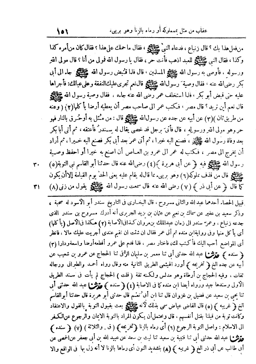 من فعل هذا بك؟ قال زنباع، فدعاه النبي صلى الله عليه وسلم، فقال ما حملك على هذا؟ فقال كان من أمره كذا وكذا، فقال صلى الله عليه وسلم للعبد اذهب فأنت حر، فقال يا رسول الله فمولى من أنا؟ قال مولى الله ورسوله، فأوصى به رسول الله صلى الله عليه وسلم المسلمين، قال فلما قبض رسول الله صلى الله عليه وسلم جاء على أبي بكر رضي الله عنه، فقال وصية رسول الله صلى الله عليه وسلم قال نعم تجري عليك النفقة وعلة عيالك: فأجراها عليه حتى قبض أبو بكر، فلما استخلف عمر رضي الله عنه جاءه، فقال وصية رسول الله صلى الله عليه وسلم قال نعم أين تريد؟ قال مصر، فكتب عمر إلى صاحب مصر أن يعطيه أرضا يأكلها (وعنه من طريق ثان) عن أبيه عن جده عن رسول الله صلى الله عليه وسلم قال: مثل به أو حرق بالنار فهو حر وهو مولى الله ورسوله، قال فأتى برجل قد خصني يقال له سندر فأعتقه، ثم أتى أبا بكر بعد وفاة رسول الله صلى الله عليه وسلم، فصنع إليه خيرا، ثم أتى عمر بعد أبي بكر فصنع إليه خيرا، ثم أراد أن يخرج إلى مصر، فكتب له عمر إلى عمرو بنم العاص أن أصنع به خيرا أو احفظ وصية رسول الله صلى الله عليه وسلم فيه (عن أبي هريرة) رضي الله عنه قال حدثنا أبو القاسم نبي التوبة صلى الله عليه وسلم قال من قذف مملوكه وهو بريء مما قال له يقام عليه يعني الحد يوم القيامة إلا أن يكون كما قال (عن أبي ذر) رضي الله عنه قال سمعت رسول الله صلى الله عليه وسلم يقول من زنى